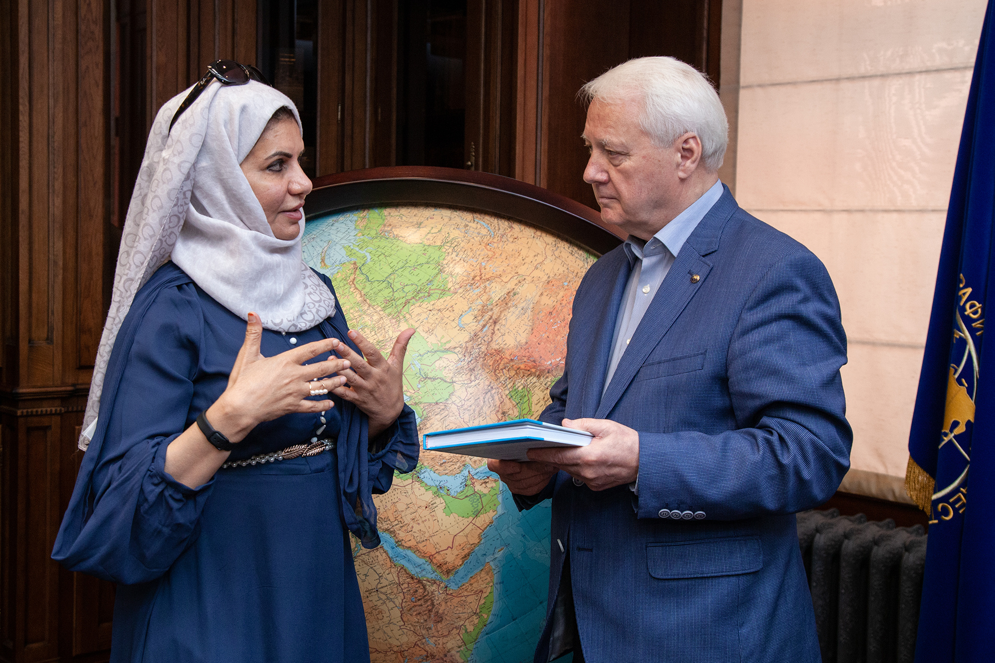 24 августа в Штаб-квартире Русского географического общества в Москве состоялась встреча с делегацией географического общества Объединённых Арабских Эмиратов во главе с его председателем — доктором Асмой Аль-Кетби Аль-Фарраджем.