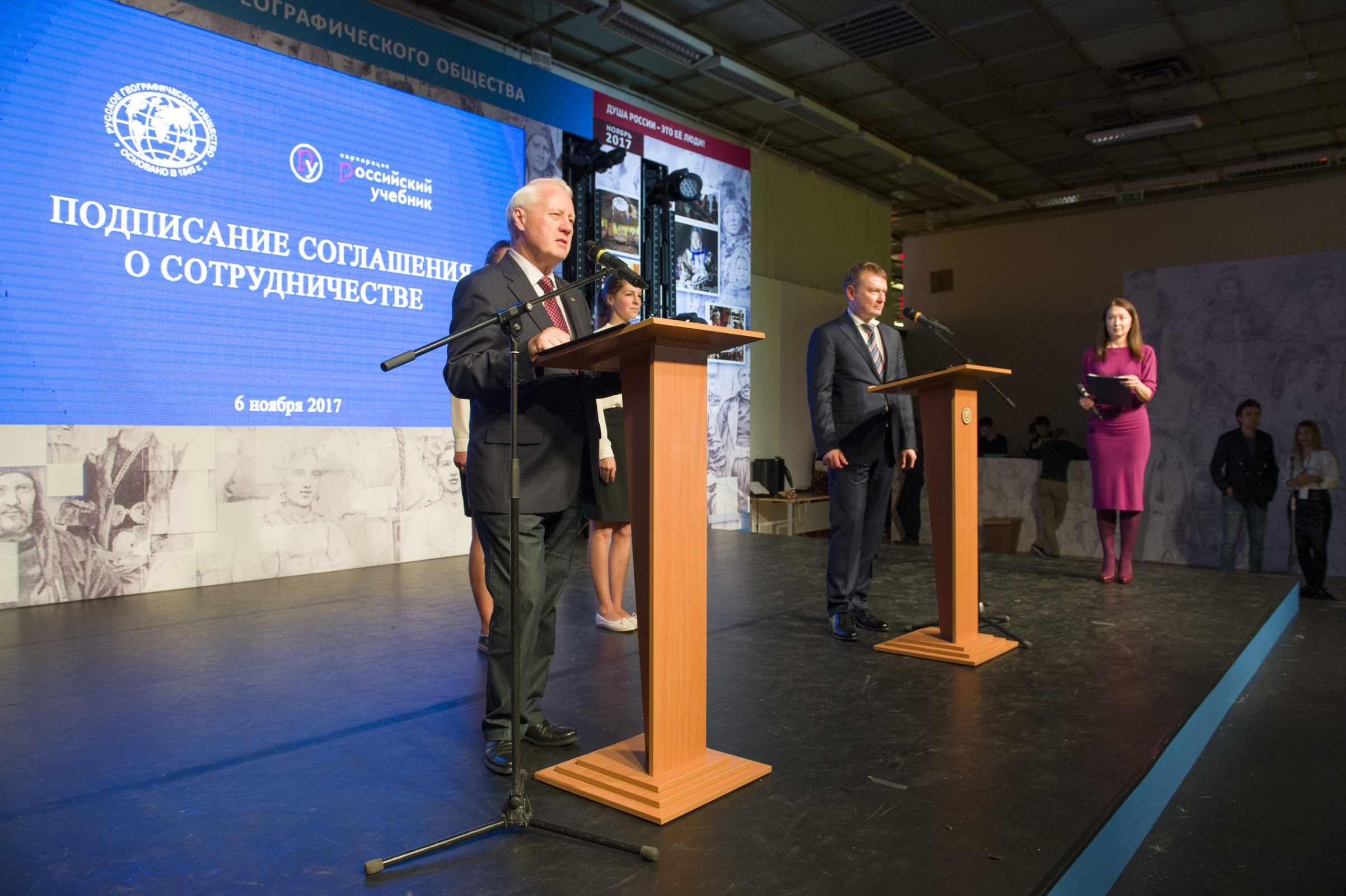 Русское географическое общество и корпорация "Российский учебник" заключили соглашение о сотрудничестве. Церемония состоялась 6 ноября на главной сцене III Фестиваля РГО в Москве. Документ подписали Первый Вице-президент РГО, академик Николай Касимов и директор корпорации Александр Брычкин.