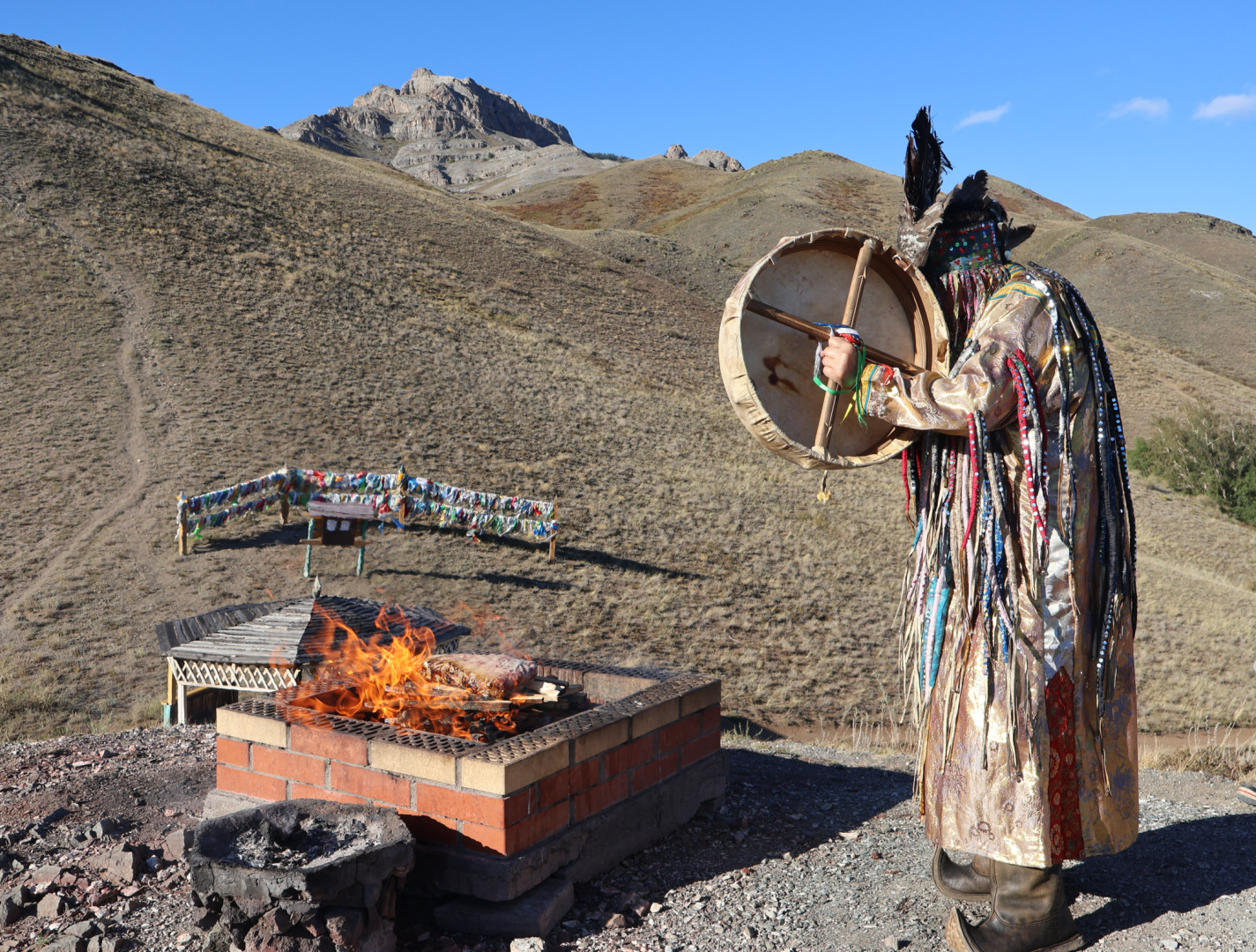 Переезд в этнокомплекс Алдын-Булаг, расположенный в долине реки Улуг-Хем. Юрточный бивак расположен здесь неслучайно: согласно преданиям, много лет назад в этой ложбине располагалась ставка верховного хана джунгаров, а потом действовал буддистский монастырь — хурээ. Эти предположения подтверждают найденные в ходе раскопок обломки ханской печати и замшелые камни с начертанием тибетской мантры процветания «Ом мани падме хум». По некоторым данным, в этом месте собирались построить буддийский храм, провели обряды очищения местности и освятили. Поэтому на сегодняшний день это место считается у тувинцев святым.
