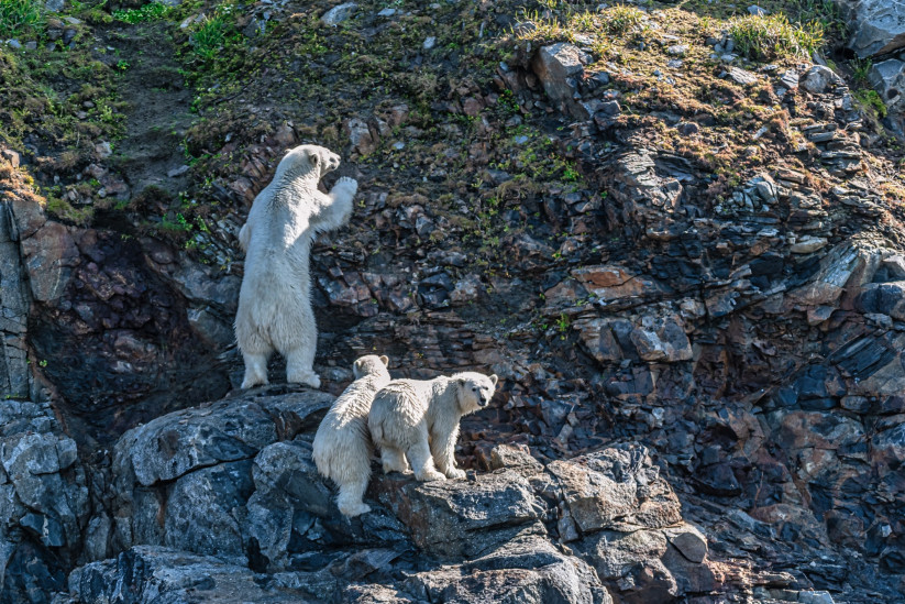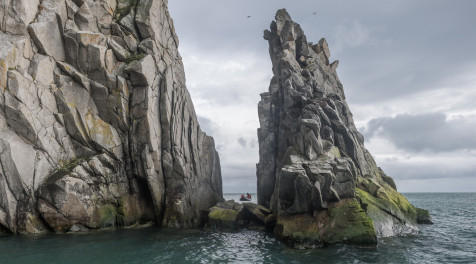 В один из дней лайнер подойдет к труднодоступному острову Геральд, расположенному в 40 километрах от Врангеля. Его скалистые берега непригодны для высадки — поэтому вы будете исследовать остров на лодках-зодиаках. Увидите лежбища моржей, впечатляющие птичьи базары, а если повезет — сможете сделать потрясающие фотографии белых медведей на фоне темных изрезанных скал.