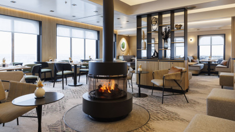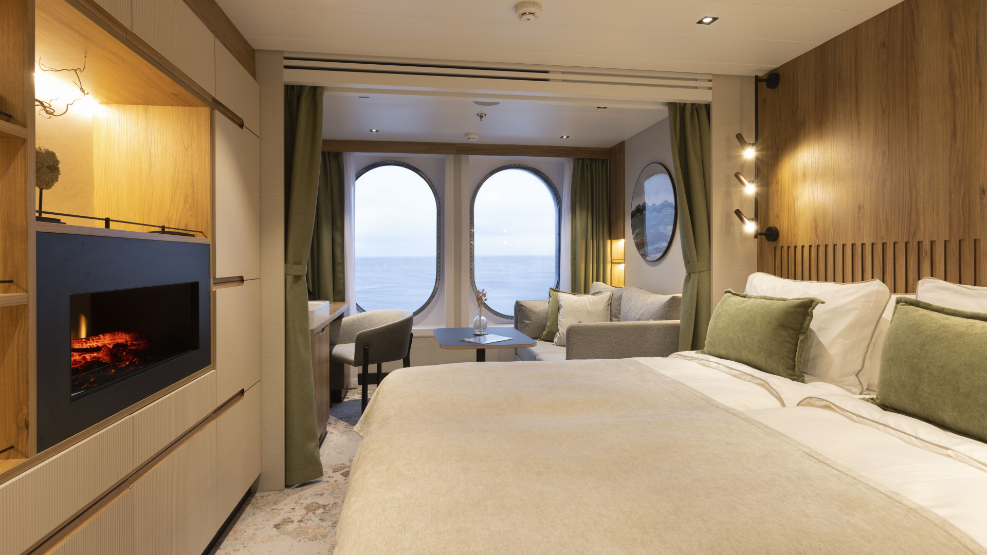 В каждой каюте: камин с эффектом живого пламени, мини-бар (пополняется ежедневно), сейф, зона для отдыха и ванная комната.
