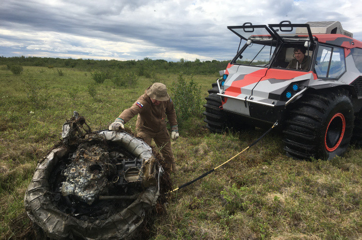 Specifically for reconnaissance purposes, everything necessary for setting up the camp of the RGS’s expedition and transport – two ATVs and a swamp buggy – was delivered here by the Mi-26 transport. However, we quickly realized that it is better to move around the area on the swamp buggy – it does not sink, unlike the ATV. And as it turned out later, only the swamp buggy was able to pull everything found by the expedition to a relatively dry place.