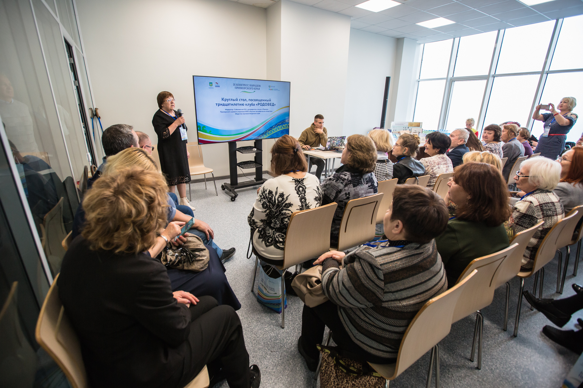 26 октября в рамках работы IX конгресса народов Приморского края состоялся круглый стол, посвященный юбилею клуба. В мероприятии приняли участие специалисты-генеалоги и люди, интересующиеся родоведением, со всего Дальнего Востока. С докладами выступили: Елена Соболивская – председатель клуба «Родовед» ПКО РГО – ОИАК (г. Владивосток), Елена Слободчикова – клуб «Амургенеалогия» (г. Благовещенск), Ольга Горелова – руководитель клуба «Находкинский родовед» (г. Находка), Ольга Жук – общество «Краевед им. В.К. Арсеньева», Елена Язовских – клуб «Арсеньевский родовед» (г. Арсеньев), Ольга Оришак – клуб «Родоведы Хабаровского края» (г. Хабаровск). Все докладчики, помимо официальных докладов о своей деятельности, преподнесли памятные тематические подарки клубу «Родовед».