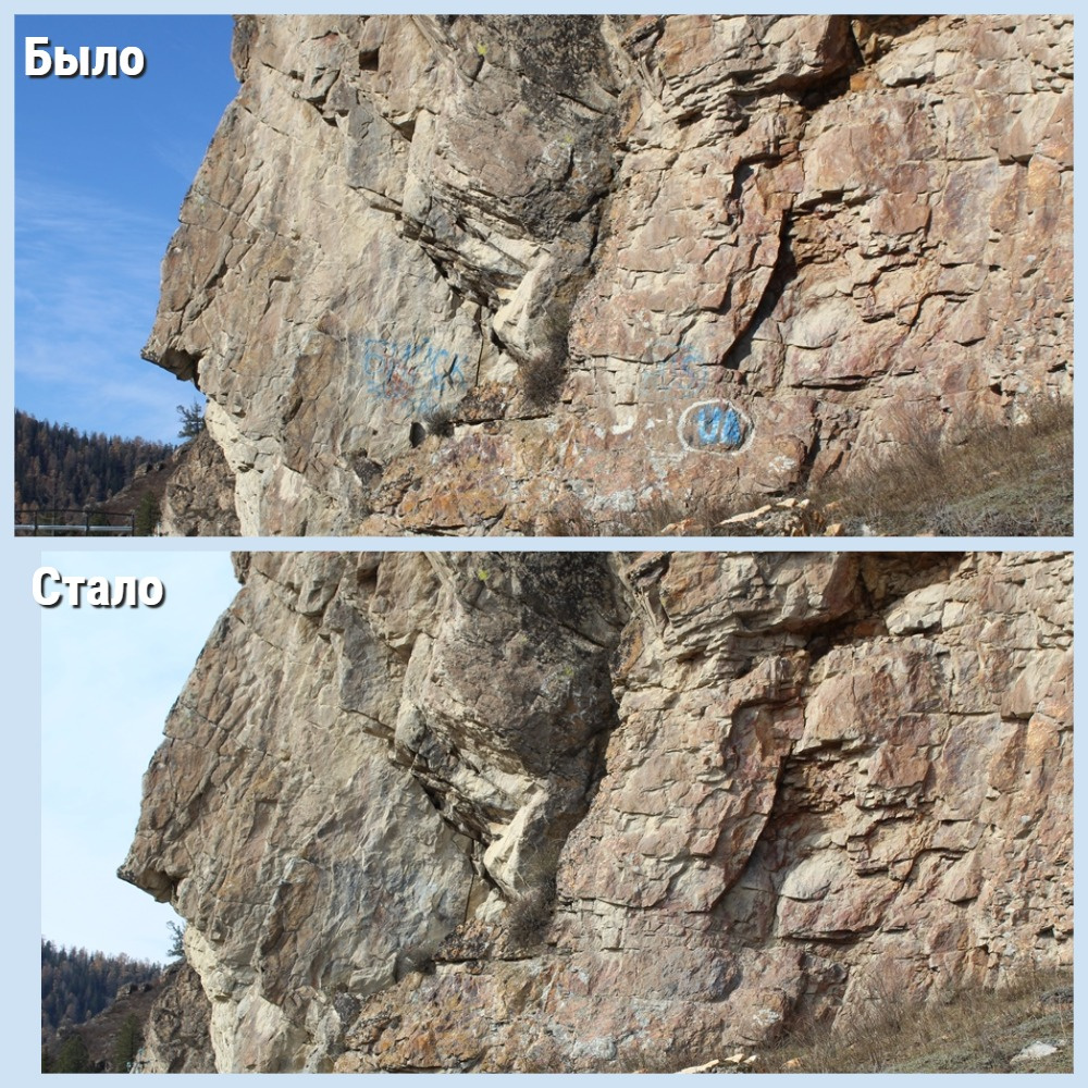В течение двух дней экологи-активисты проводили очистку скал с помощью специального пескоструйного оборудования. Всего было очищено более 70 надписей на площади более 50 м2. Эта волонтерская экспедиция прошла в рамках международной акции #ЧистыегГоры2025, которая проводится при поддержке компании Greenway Global.
