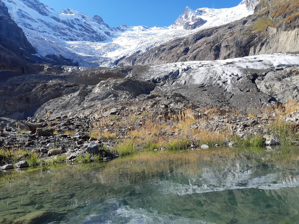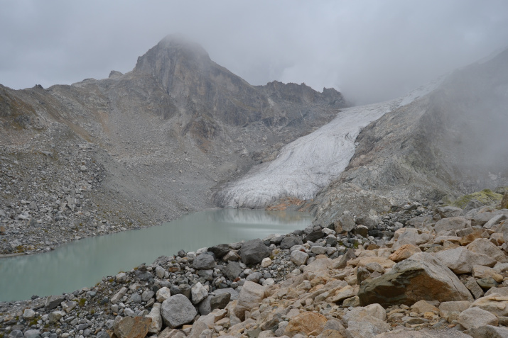 Третий этап экспедиции - Восточно-Клухорский ледник и озеро. Этот ледник интенсивно отступая оставляет за собой озеро, которое вклинивается в его ледовую стену. За последние лет 5-10 интенсивность таяния сильно возросла и ледник отступил немного выше, тем самым сформировав четкие границы берега озера.