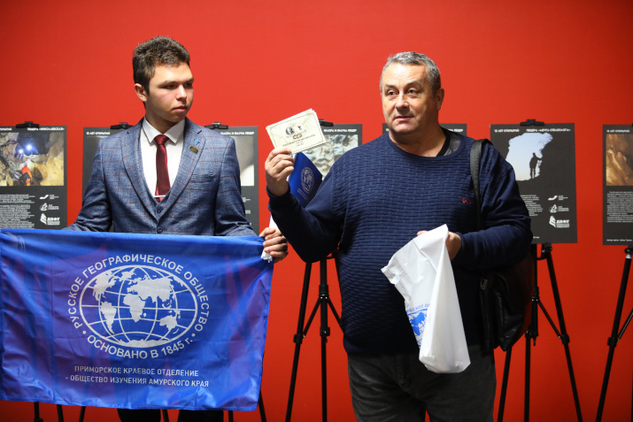 Исполнительный директор ПКО РГО-ОИАК Охрименко Евгений от имени всех членов Общества пожелал членам Клуба и всем собравшимся успехов и преподнес в дар Клубу спелеологов ДВФУ флаг Русского географического общества, а также сувениры, приуроченные состоявшейся в 2024 году 140-й годовщине со дня образования Общества изучения Амурского края, - флажки, значки и почтовые открытки с символикой ОИАК.