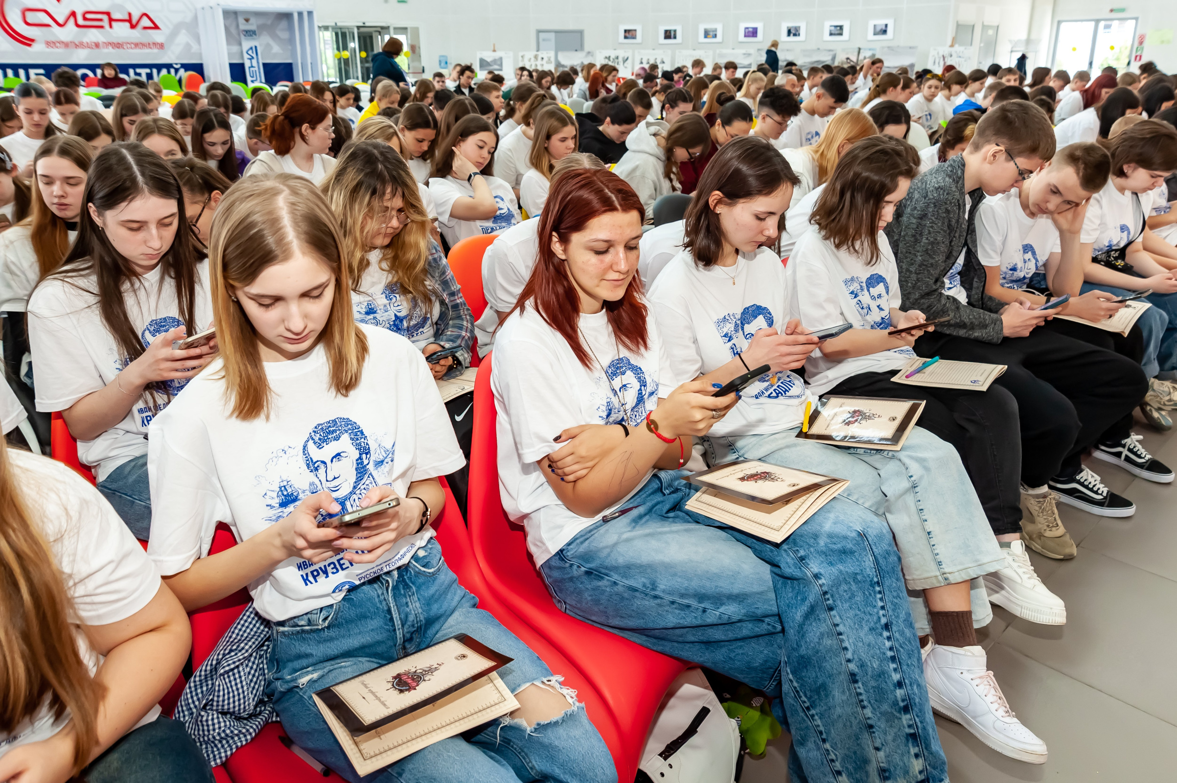 В первый день работы смены школьники познакомились с экспозицией фотовыставки Русского географического общества «Иван Крузенштерн — первый русский плаватель вокруг света». На ней представлены репродукции уникальных гравюр из «Атласа к путешествию вокруг света капитана Крузенштерна». Ребята увидели отдаленные уголки Земли глазами участников экспедиции, которая прошла в начале XIX века. Атмосферу морских приключений создают живописные пейзажи, портреты местных жителей, подробности открытий мореплавателей.