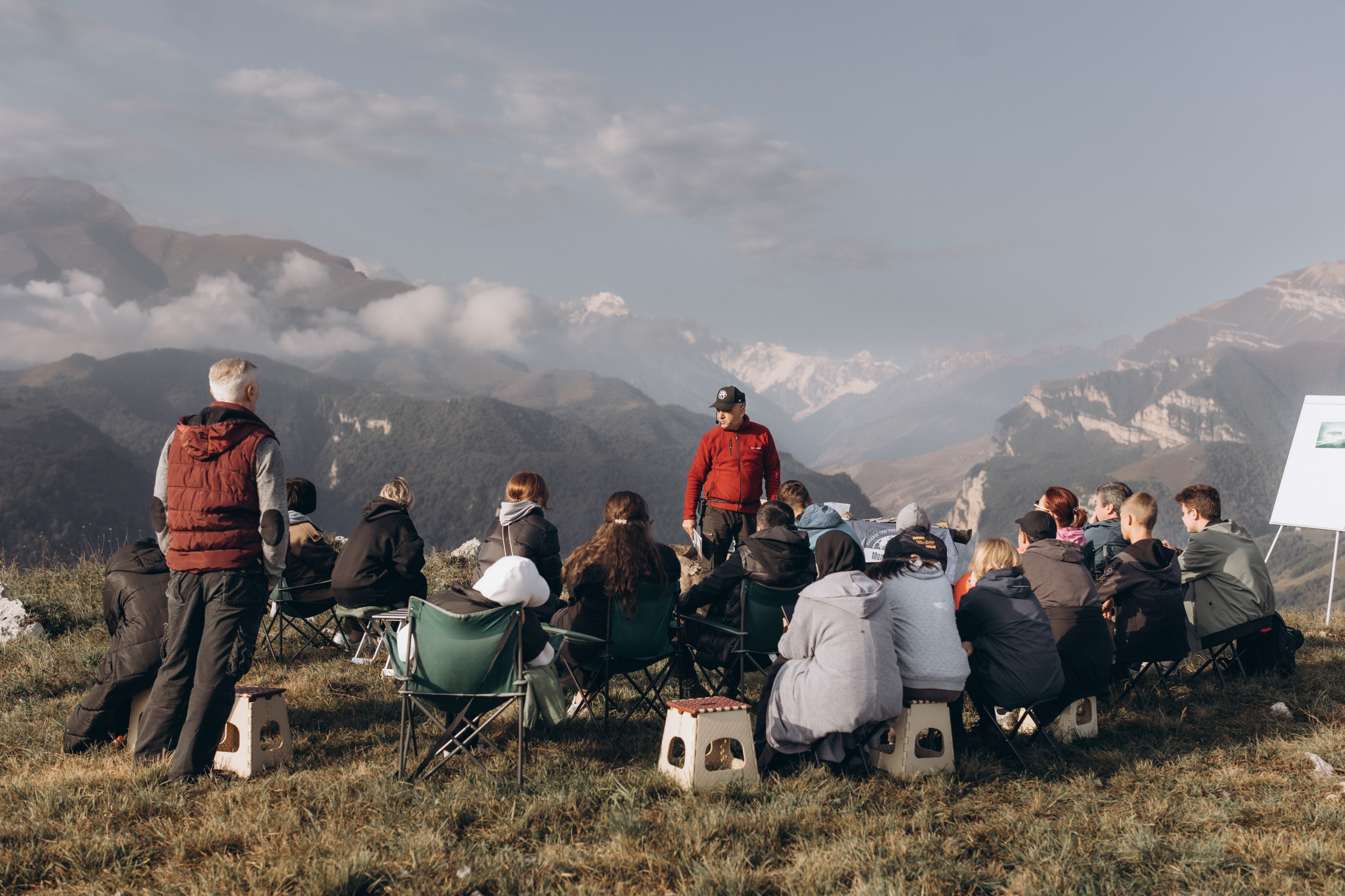Много нового о горах и Кабардино-Балкарии узнали участники проекта, которые ранним утром выехали в урочище Хумалан. Уже там встретили рассвет с видами на Безенгийскую стену и рассказом о самых высоких вершинах Кавказа от педагога, географа-краеведа, члена Русского географического общества Чомая Геляева. В числе 40 участников проекта были: руководители министерств, педагоги высшего образования, представители профессионального сообщества, СМИ, члены Отделения РГО в КБР и представители молодежного клуба РГО "Альтаир".