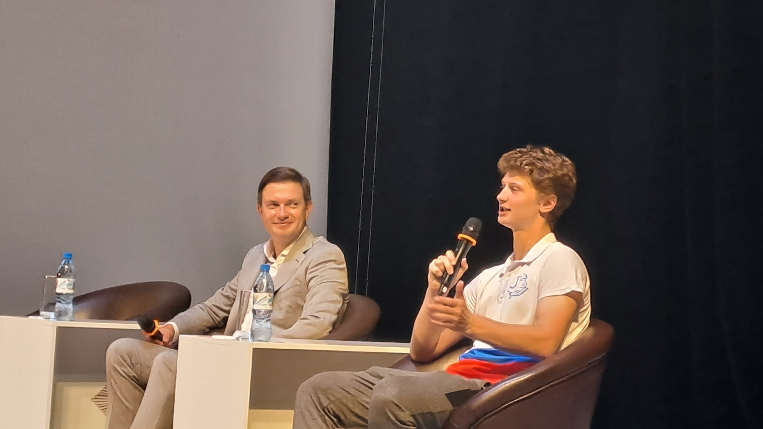 На встречу Иван Геннадьевич пришел не один. На сцену он попросил также подняться одного из героев киноленты «Мир открытий» и «выпускника» профильных смен РГО Родиона Почтарь, который был участником шести смен Русского географического общества, а сегодня работает в ВДЦ «Орленок» и учит ребят азам туризма. Он рассказал, как сложилась его судьба и как на нее повлияло участие в «Мире открытий», а также ответил на многочисленные вопросы.