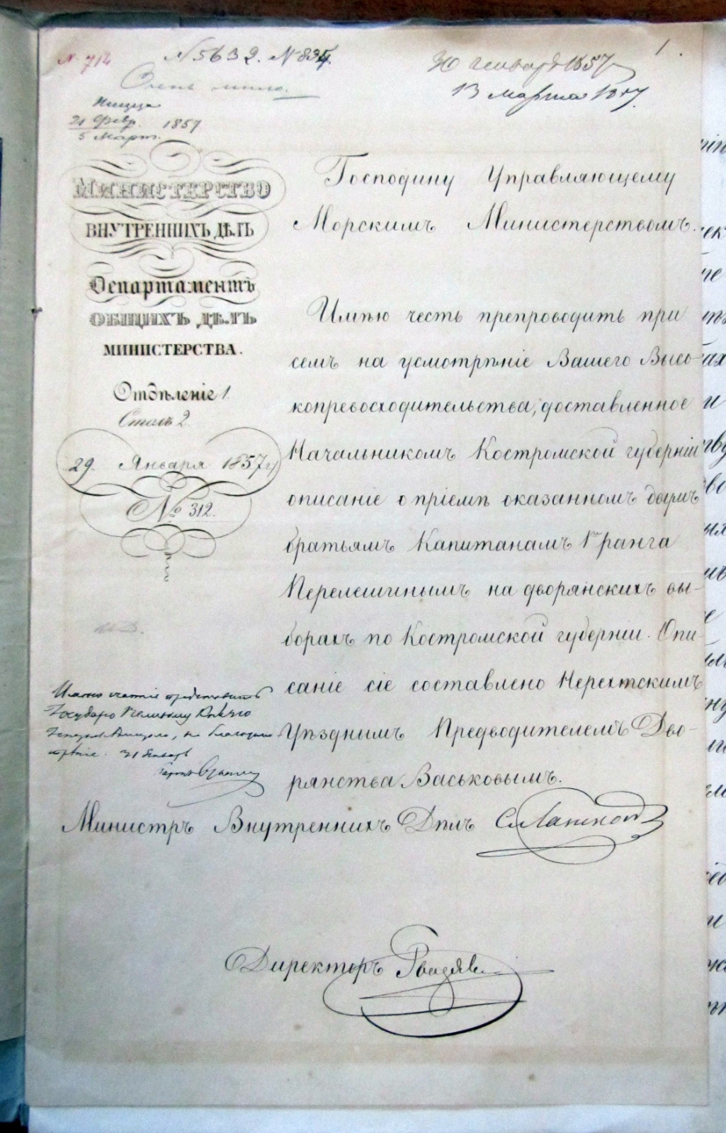 Министр внутренних дел С. Ланской – управляющему морским министерством, 29 января 1857 г.: препровождаю на усмотрение доставленное начальником Костромской губернии описание о приеме, оказанном двум братьям капитанам 1 ранга Перелешиным на дворянских выборах по Костромской губернии. Описание составлено нерехтским уездным предводителем дворянства Васьковым.
