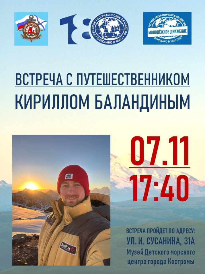 7 ноября в музее Детского морского центра г. Костромы состоится встреча с Кириллом Баландиным «Путешествия для познания мира, как способ познания себя».