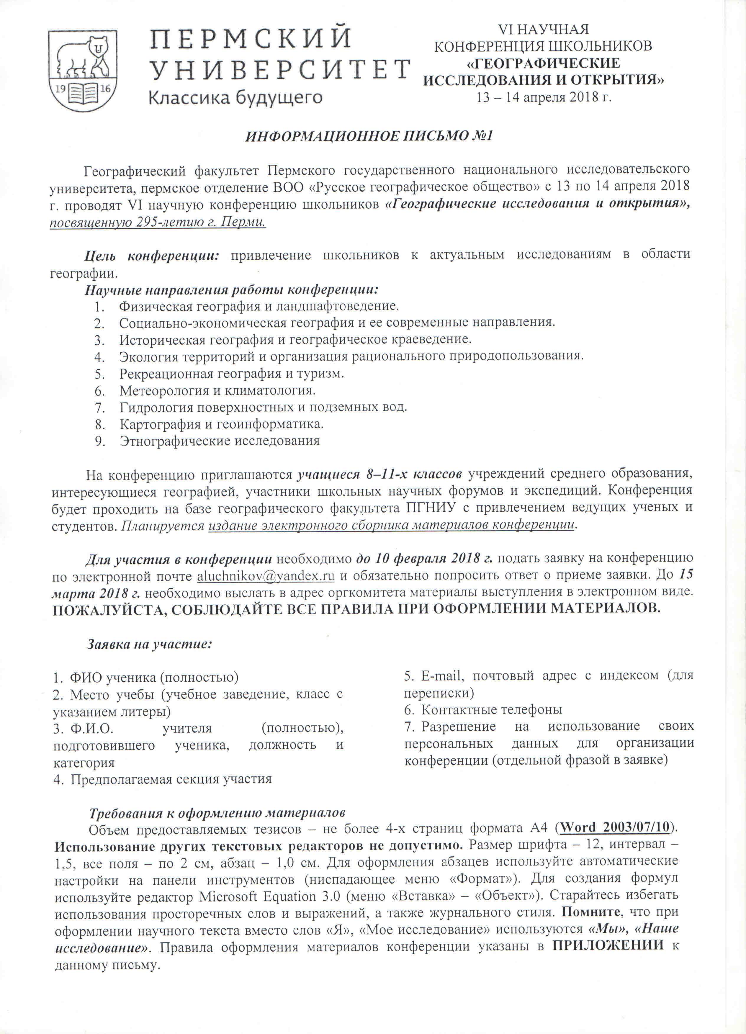 Географический факультет Пермского государственного национального исследовательского университета и Пермское краевое отделение Русского географического общества приглашают Вас принять участие в VI научной конференции школьников "Географические исследования и открытия", которая состоится в период с 13 по 14 апреля 2018 г.