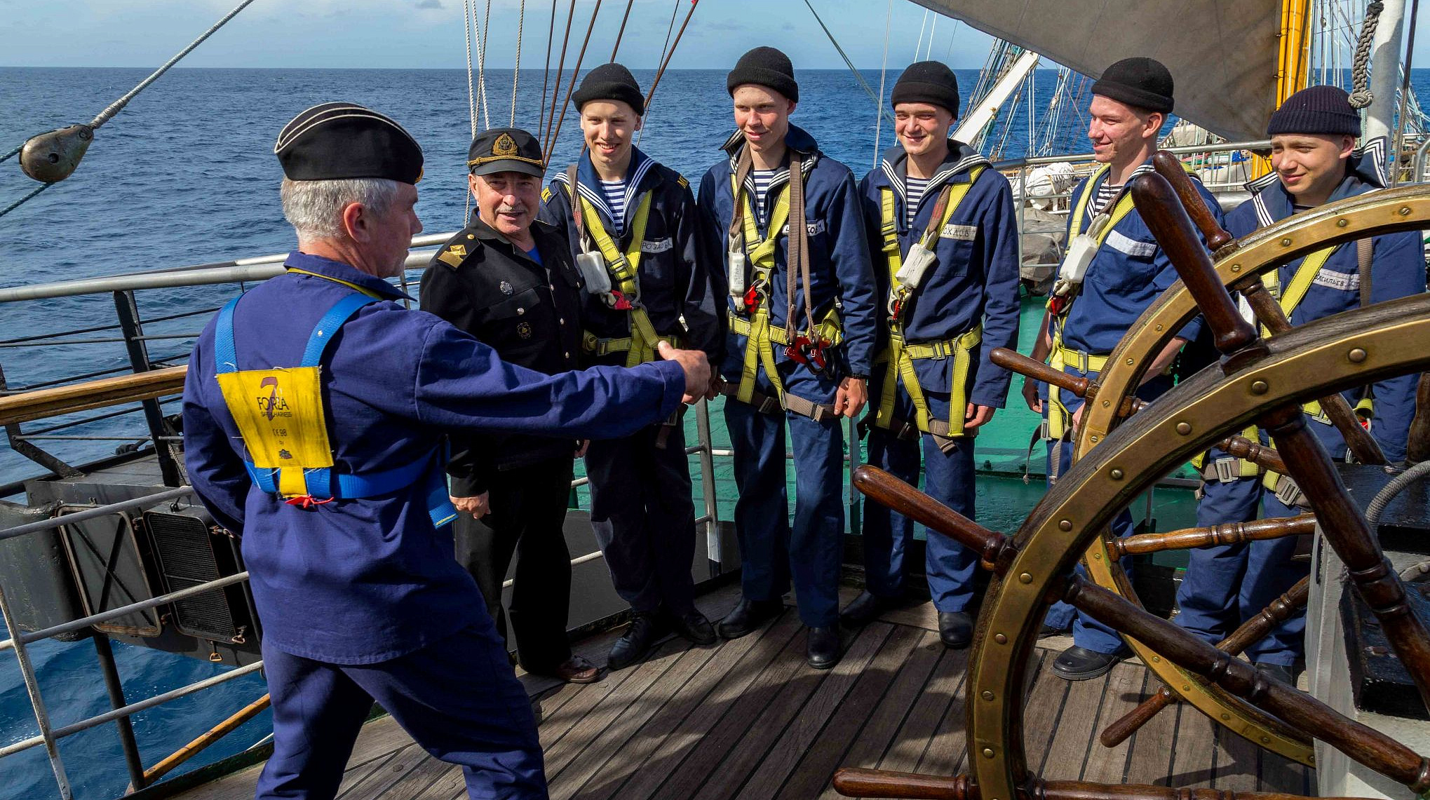 «Сегодня отстоял свою первую вахту на руле. Это намного интереснее, чем чистить картошку на камбузе. Управлять целым фрегатом и наблюдать романтику моря – самое незабываемое ощущение от этой вахты. Первая смена прошла с 8 до 12 вечера, уже давно стемнело – вокруг не видно ни огня… Но ощущение полезности для экипажа, который уже отдыхал после рабочего дня, давало мне какую-то гордость за себя и ощущение важности здесь. Как будто я всю жизнь к этому шёл, чувствовал себя героем романов Джека Лондона. Утренняя вахта с 8 до 12 преподносила свои сюрпризы: дождь, сильная волна до 7 баллов, крутой крен. Тяжёлая управляемость руля и сама сложность вахты в такие моменты только прибавляли интерес. Очень повезло с напарником, опытным рулевым, который попутно объяснял все тонкости управления, и рассказывал интересные истории в портах (4 часа – достаточное время для общения). Вахта на руле не бывает скучной».