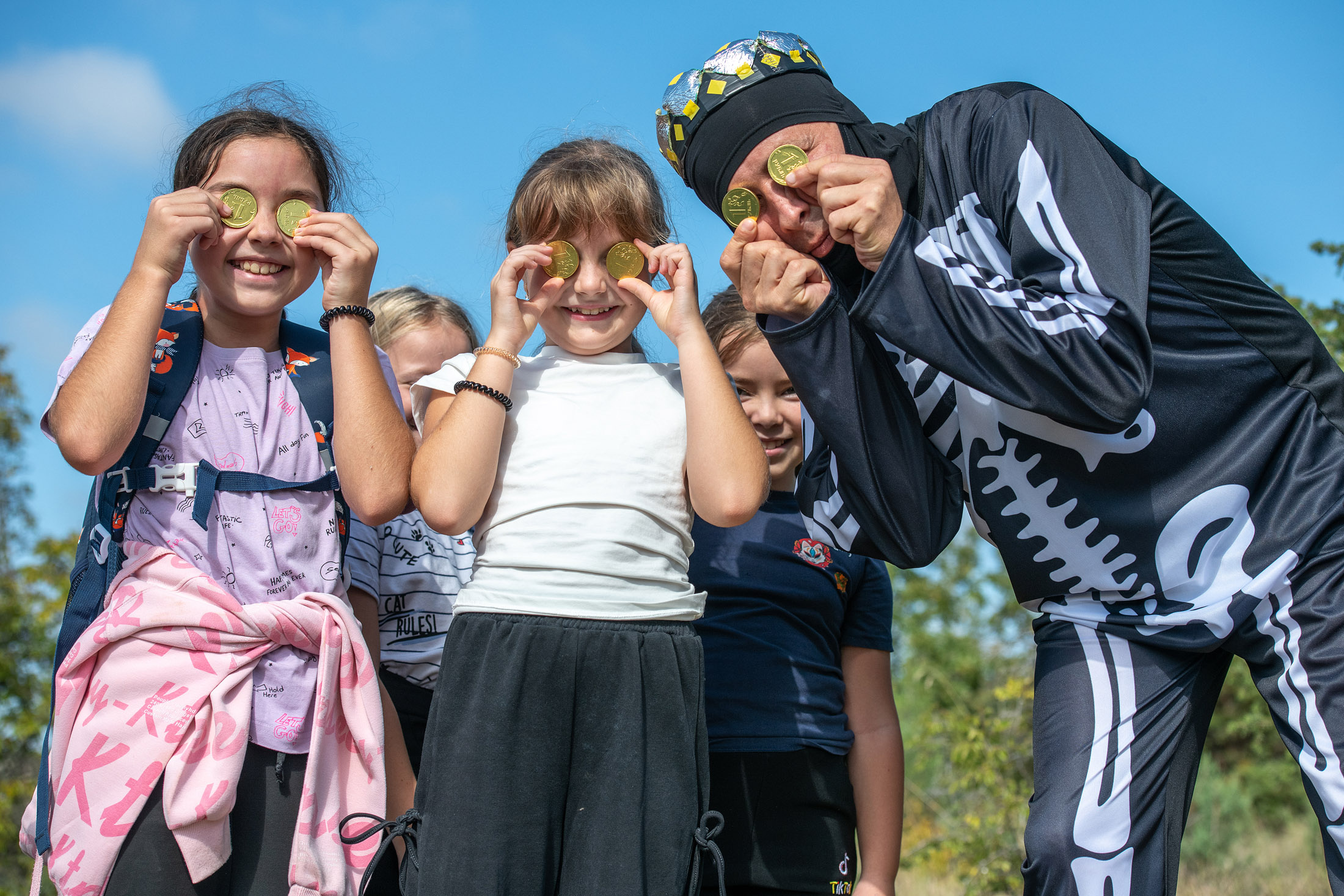 За оврагом ребят поджидал сам Кощей Бессмертный, который обиделся на Бабу-Ягу за то, что та не пригласила его на праздник. Дети быстро исправили эту оплошность и подружились с хитрецом. А как было не подружиться, ведь он приготовил для них целую игровую программу! Ребята играли с монетами, искали клад в развалинах храма, звонили в колокола и перетягивали канат.