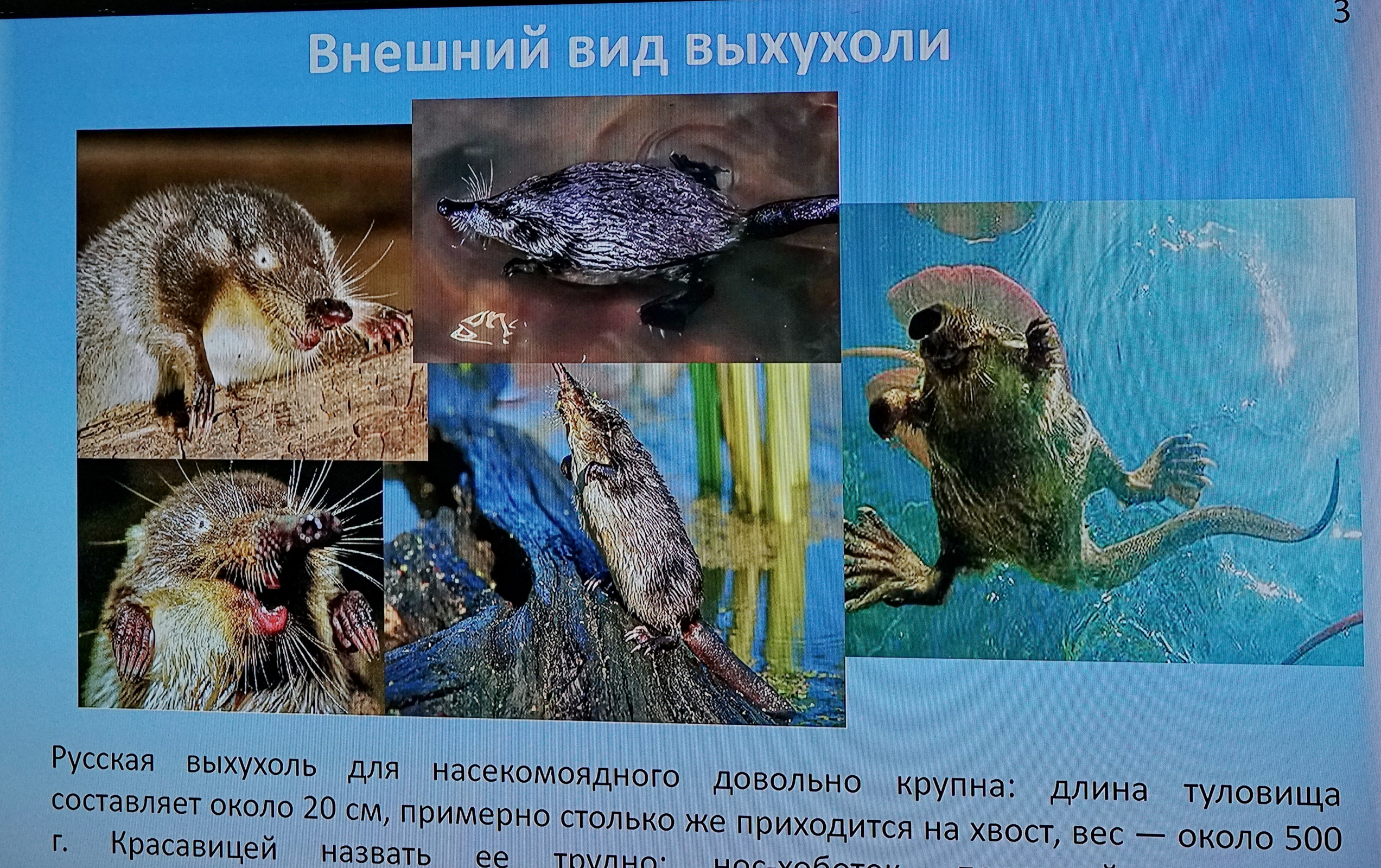 Русская выхухоль — это уникальное животное, которое относится к отряду насекомоядных. В настоящее время существует только два вида выхухолей: пиренейский и русский. За свою способность рыть подземные норы и отлично плавать выхухоль называют «водяным кротом». В народе же это животное ласково прозвали «хохулей». Русская выхухоль является одним из самых малоизученных видов млекопитающих. Она также является эндемиком России и единственным видом среди млекопитающих, в названии которого присутствует слово «русская».