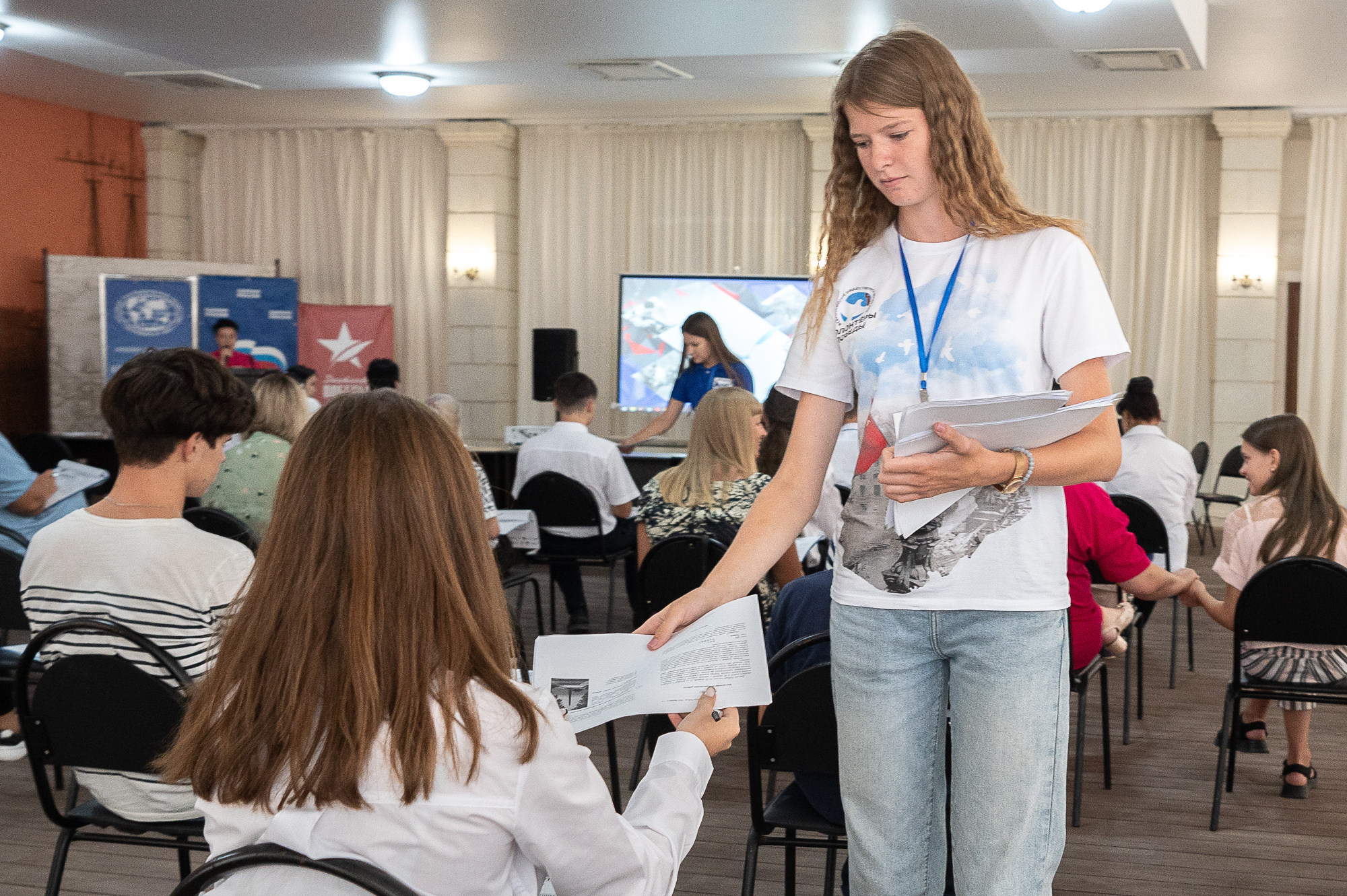 Организация площадки не обошлась без участия Волонтеров Победы - ребята помогали с регистрацией участников, сбором бланков и навигацией гостей по площадке.