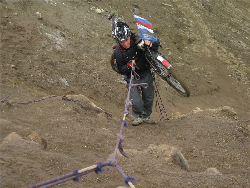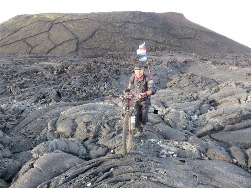 - Три года назад я перешёл на колеса большего диаметра, они лучше приспособлены для путешествий, у них эффективнее накат и курсовая устойчивость. Багажник, от которого тоже многое зависит в длительных путешествиях, я искал довольно долго и нашёл-таки модель надёжную, прочную и оригинальной зауженной формы. Сзади у меня две сумки - не люблю рюкзаки - "однообъёмники". В таких всё кучей, ничего не найдешь. У меня же все практично и удобно. На одной сумке написано «ПР» - это продукты, а на второй - «ОД», одежда. Я точно знаю, что и где лежит. Ещё есть сумки на руле и на раме. На перо передней вилки подвешены бачки с водой, с другой стороны - палатка. Велосипед должен быть загружен равномерно. Ведь мой маршрут, случается, проходит по заваленным буреломом лесным проселкам, тем же песчаным пустыням, козьим тропам где-то в горах и даже по склонам вулканов, - рассказывает красноярский путешественник.