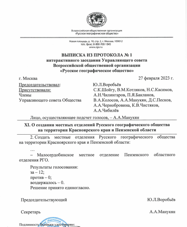 Русское географическое общество продолжает активное расширение своего присутствия в Сурском крае. Новое местное отделение, Малосердобинское появились в Пензенской области. Решение об его открытии официально утверждено Управляющим советом РГО.