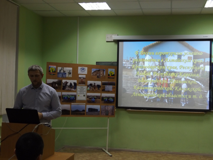 Затем слушателям был представлен доклад «Развитие агротуризма в регионе и в России». Кривцов Иван Викторович, доцент, кандидат сельско-хозяйственных наук, исполняющий обязанности заведующего кафедрой «Агротуризм и региональное краеведение» ВолГАУ подробно осветил вопросы сущности агротуризма, как современного и быстро развивающегося направления мирового туристского бизнеса, его развитие в европейских странах и привлекательность для туристов в России. Также были рассмотрены возможности агротуризма в нашей стране и Волгоградской области, анализировались перспективы и препятствия в развитии этого интересного туристского направления. Выступление сопровождалось демонстрацией разработок агротуристических паспортов районов области и большим количеством статистических данных. Доклад вызвал большой интерес аудитории, выразившийся в массе вопросов к выступающему.