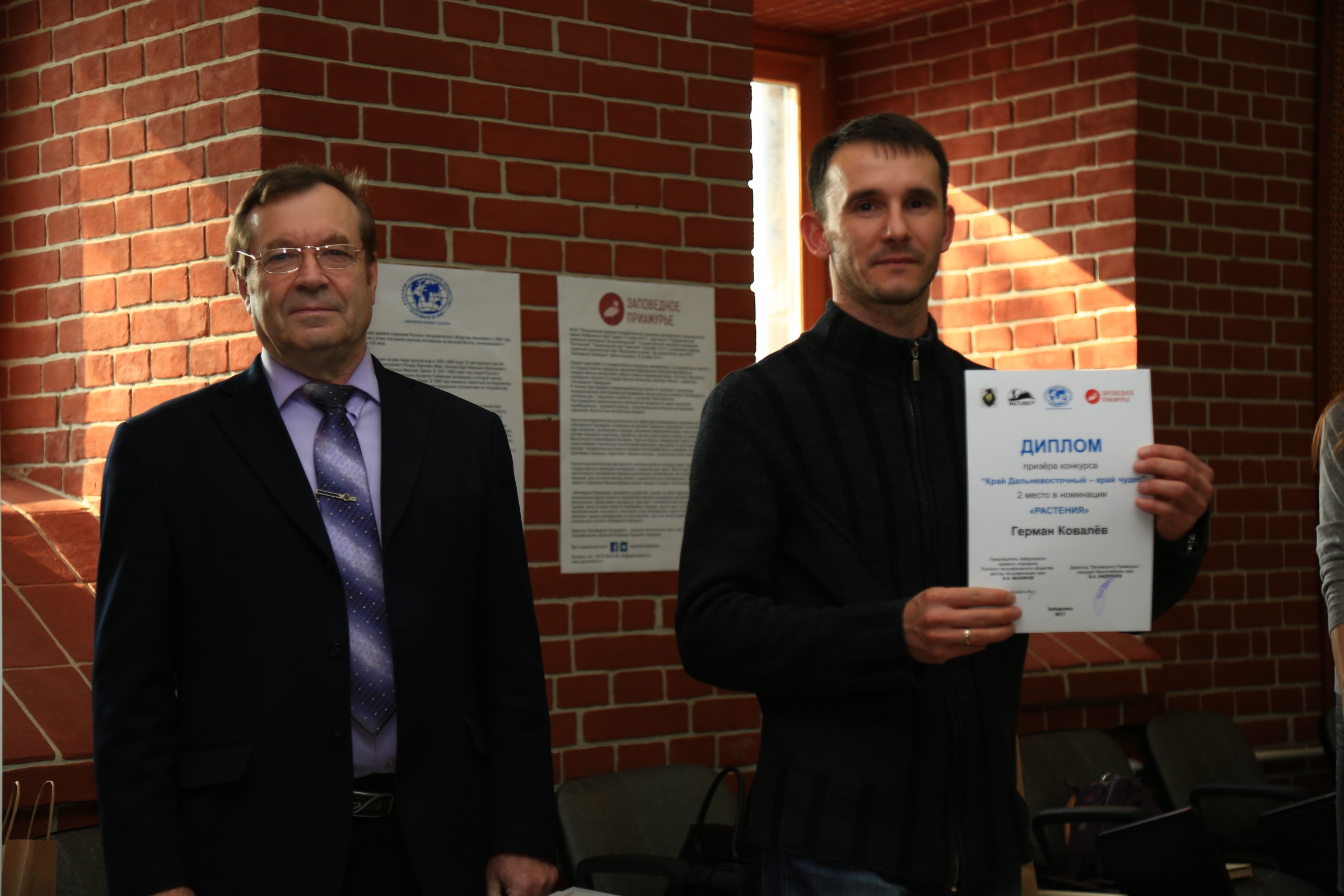 Председатель Хабаровского краевого отделения Русского географического общества А.Н. Махинов и директор ФГБУ «Заповедное Приамурье» В.А. Андронов наградили победителей грамотами и подарками.