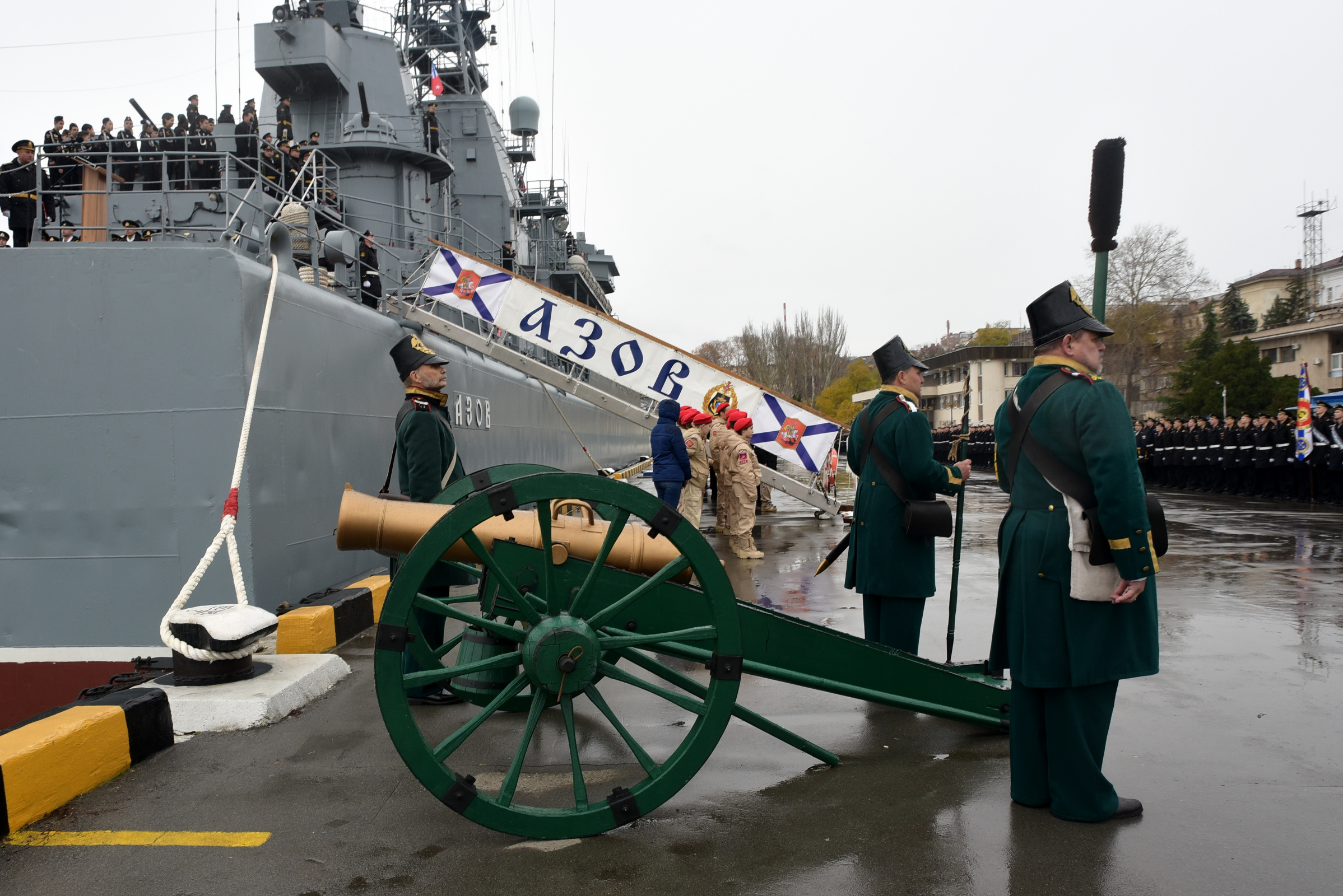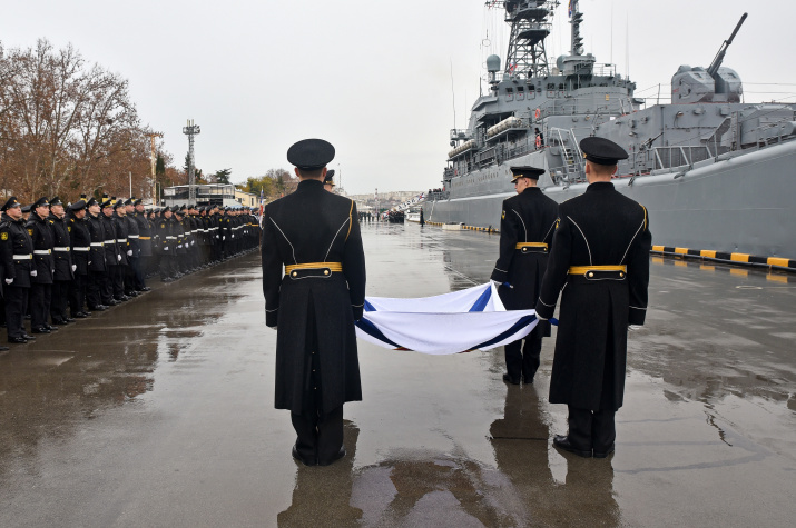 Торжественные мероприятия 28 ноября начались с обряда освящения полотнища во Владимирском соборе Севастополя. В усыпальнице адмиралов присутствовали представители главного командования ВМФ, командующий Черноморским флотом адмирал Игорь Осипов, представители региональных отделений РГО и РВИО, ветераны экипажа корабля, юнармейцы и другие гости. По завершении литургии участники церемонии возложили цветы к могилам адмиралов. Затем на площади морского вокзала Севастополя символ Военно-морского флота был передан командиру корабля "Азов".