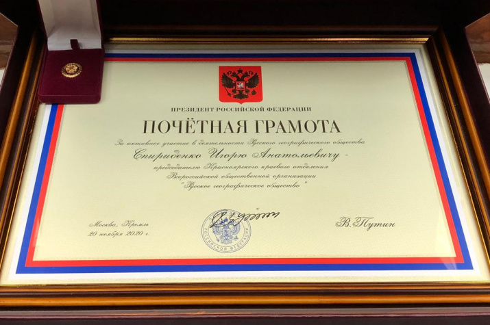 Почётную грамоту Президента Российской Федерации "За активное участие в деятельности Русского географического общества" вручили в Москве председателю Красноярского краевого отделения РГО Игорю Спириденко.