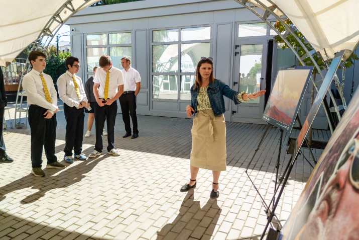 В Музейном дворике Краснодарского художественного музея имени Федора Коваленко продолжается выставка Русского географического общества «Букет вершин Сергея Дудко», посвященная памяти заслуженного путешественника и художника России. Экскурсию для школьников провела член Союза художников, дочь заслуженного путешественника — Людмила Шабалина.