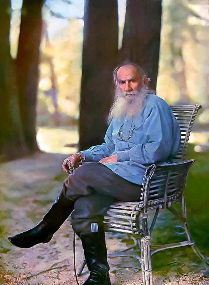 Единственный цветной портрет Льва Толстого относится к числу самых ценных и известных фотографий Прокудина-Горского. Снимок сделан 23 мая 1908 года незадолго до 80-летия писателя.