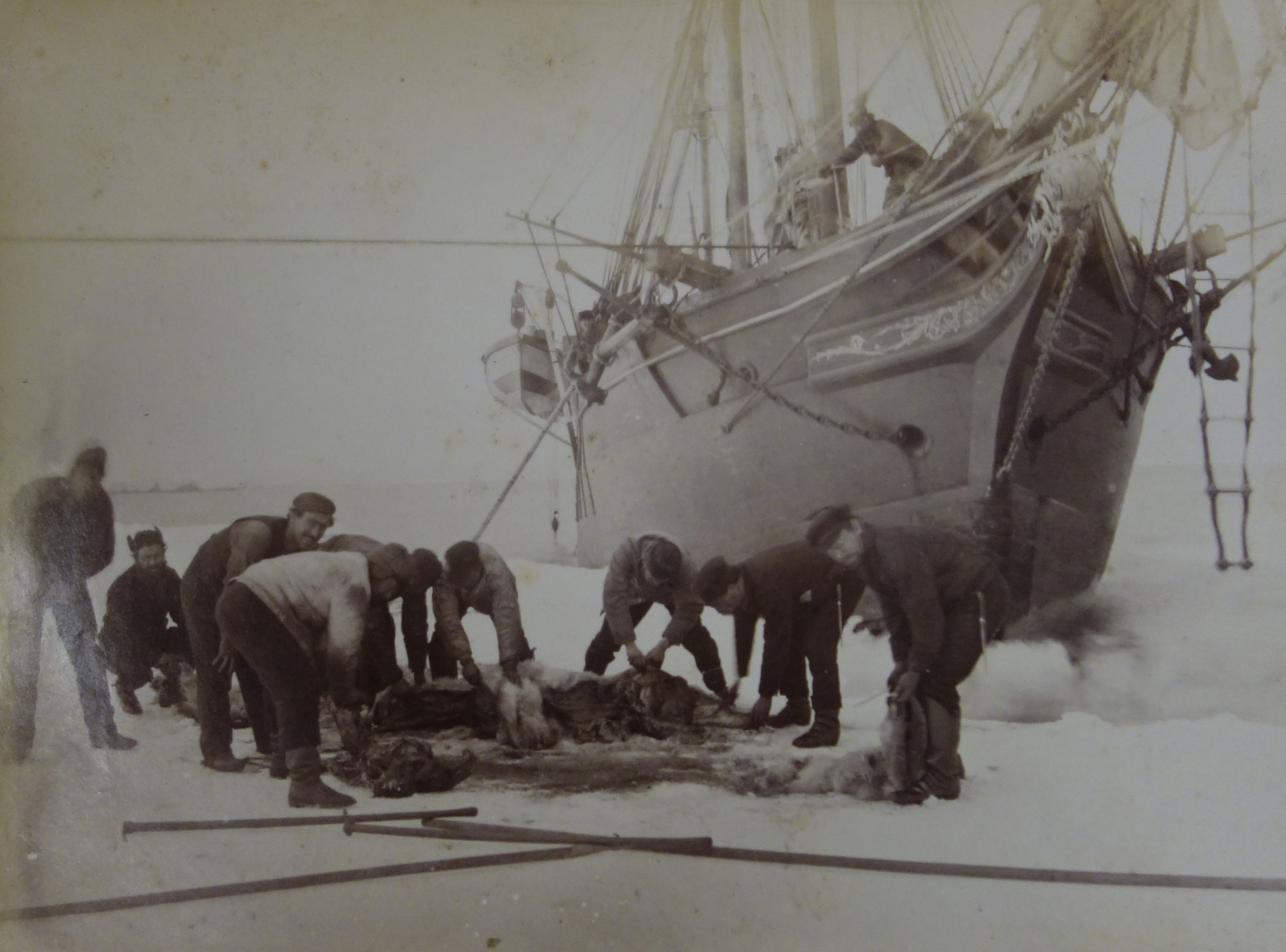 Шарлотта Мур показывает фотографии экспедиции. Вот "Эйра" берет на борт запас пресной воды, вот прибывает к Земле Франца-Иосифа. Бенджамин Ли Смит дал более 40 названий географическим объектам архипелага, он выбирал для них имена членов своей семьи: есть фотография острова Мэйбл, любимой племянницы Ли Смита. Следующее фото – Бен тащит лодку на берег, фото – он разделывает тушу белого медведя. А вот стоят на льду шотландские моряки, крепкие ребята, никто не надел свитер, и белые рубашки сливаются со снежными вершинами за их спинами.
