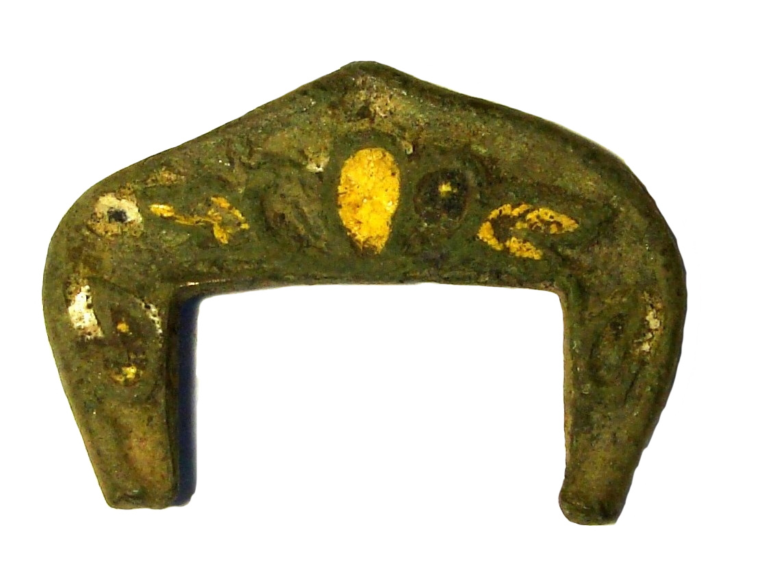 Из верхнего горизонта культурного слоя происходит фрагмент бронзовой пряжки, оформленной с внешней стороны растительным рельефным декором в виде трилистника и отходящих от него листьев. Примечательно, что рисунок расцвечен желтой, синей и белой эмалью, что характерно для изделий, широко бытующих в Московском государстве второй половины XVII в., бурно развивающемся после событий «смутного времени».
