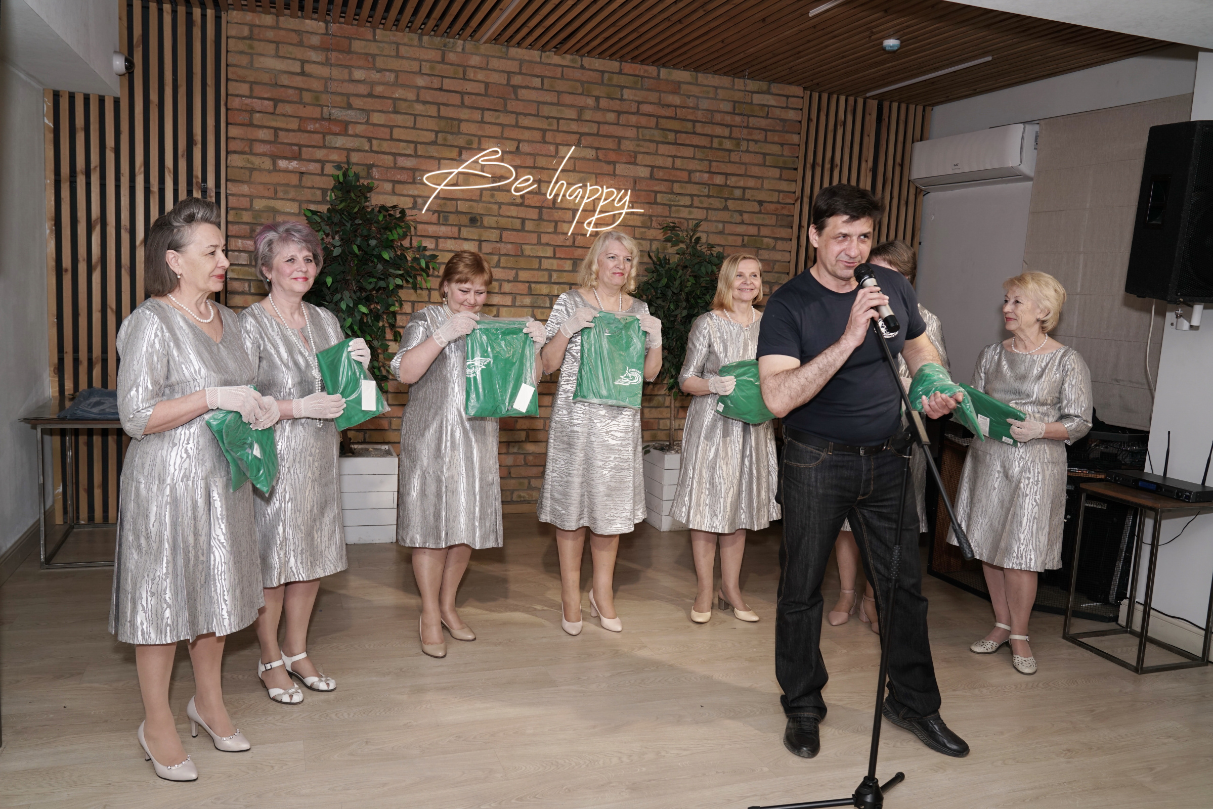 В этот раз творческий вечер начался с приветствия председателя областного отделения РГО Игоря Пантюшова, который пожелал гостям успешного выступления и подарил каждой из 7 участниц коллектива по зеленой фирменной футболке экологического движения «Зелёная волна», а также, уже по традиции, вручил руководителю грампластинку с записью песен Жанны Бичевской.