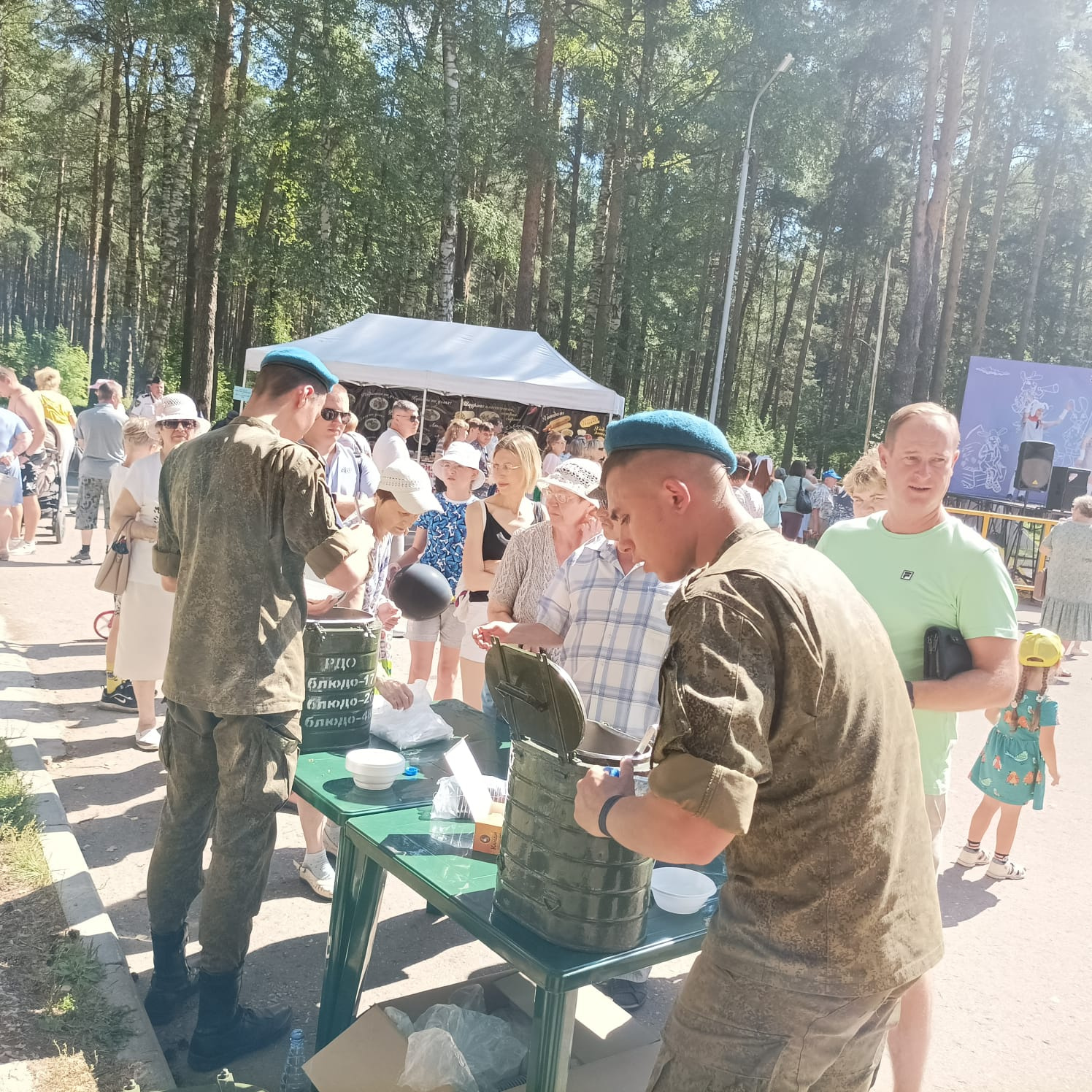 Для посетителей и участников мероприятия была организована полевая кухня с гречневой кашей с мясом, которую для праздника приготовили бойцы Костромского гвардейского артиллерийского 1065 полка.