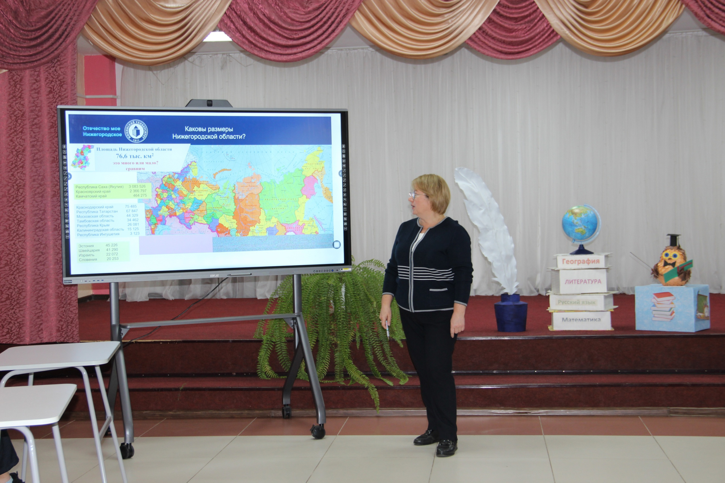 Заведующая кафедрой географии, географического и геоэкологического образования НГПУ им. К. Минина, член Совета Нижегородского регионального отделения РГО Ирина Кривдина провела интерактивную игру с пятиклассниками «Отечество мое Нижегородское».