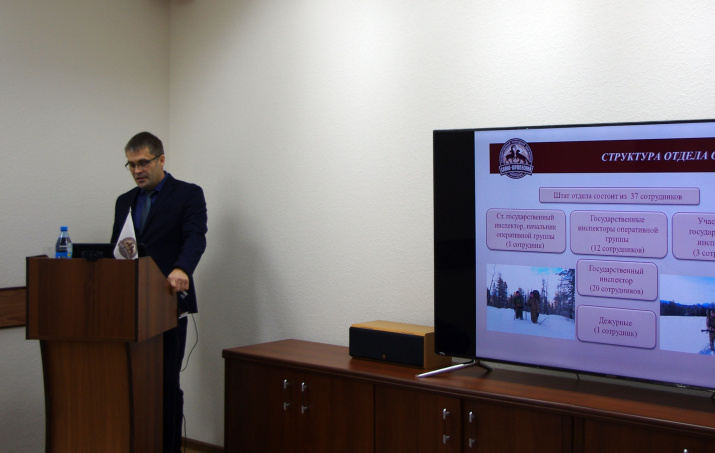 Первый доклад в рамках работы заседания, посвящённый территории национального парка "Шушенский бор", представил заместитель директора по управлению национальным парком – Владимир Званцев. Он рассказал о территории парка, направлениях деятельности, инфраструктуре, материально-техническом обеспечении, а также о первых шагах деятельности парка в составе Объединённой дирекции. Так, формируется система работы оперативной группы и в Горном, и в Перовском кластерах парка, пересматриваются направления научно-исследовательской деятельности, проводится инвентаризация туристских объектов и другие необходимые мероприятия.