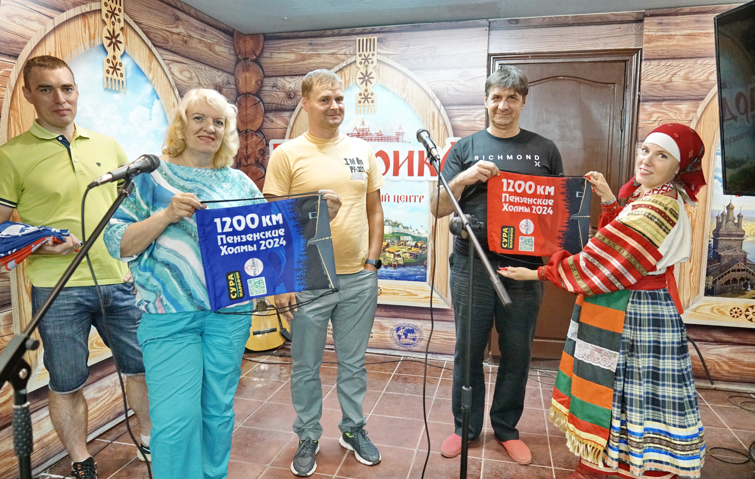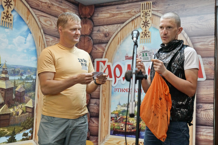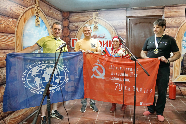 Максим Зуев передал Игорю Пантюшову — руководителю областного отделения Русского географического общества — флаг РГО и копию Знамени Победы. С ними марафонцы проходили дистанцию, посвящённую 83-й годовщине начала Великой Отечественной войны. Также он вручил медаль участника «Супер-бревет — 1200 км» и атрибутику марафонцев.