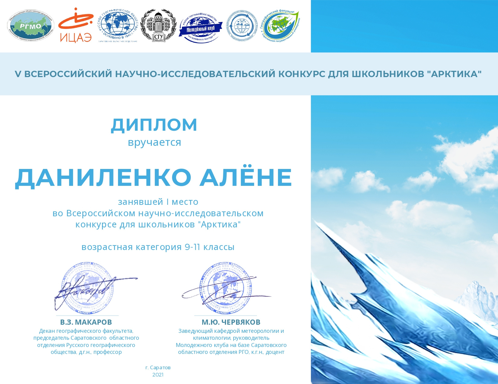 О конкурсе: Всероссийский научно-исследовательский конкурс для школьников «Арктика» проводится Молодежным клубом на базе Саратовского областного отделения Русского географического общества, географическим факультетом Саратовского национального исследовательского государственного университета имени Н.Г. Чернышевского, Саратовским областным отделением Русского географического общества, Информационным центром по атомной энергии (ИЦАЭ) Саратова при поддержке Саратовского регионального отделения Российского гидрометеорологического общества.