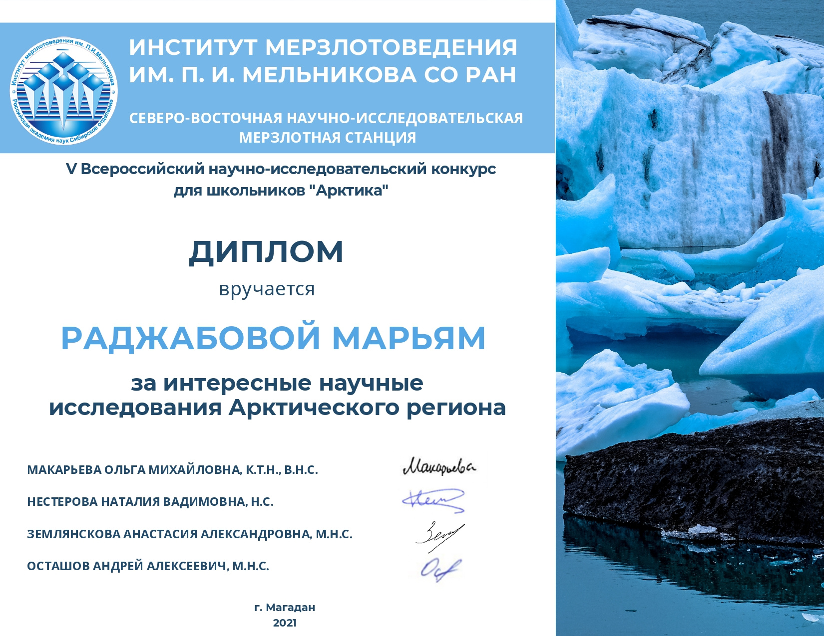 Так как в этом году было много работ, связанных с изучение многолетней мерзлоты, то в жюри, помимо представителей общественных организаций РГО, РГМО, ИЦАЭ Саратова и сотрудников географического факультета СГУ, были приглашены специалисты, напрямую занимающиеся такими исследованиями - сотрудники Северо-Восточной научно-исследовательской мерзлотной станции Института мерзлотоведения им. П.И. Мельникова СО РАН, одна из которых, Землянскова Анастасия - выпускница кафедры метеорологии и климатологии СГУ.