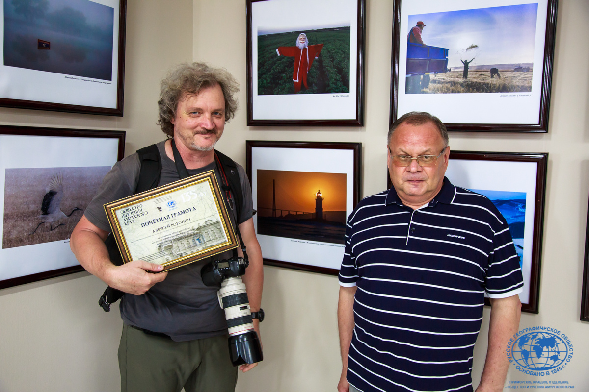 В ходе открытия выставки также состоялась торжественная церемония вручения наград участникам. От лица Приморского краевого отделения Русского географического общества – Общества изучения Амурского края председатель Алексей Буяков вручил почётную грамоту ПКО РГО – ОИАК участнику выставки Алексею Воронину за уникальное авторское видение и мастерски переданную атмосферу зарождения нового дня на Дальнем Востоке России.