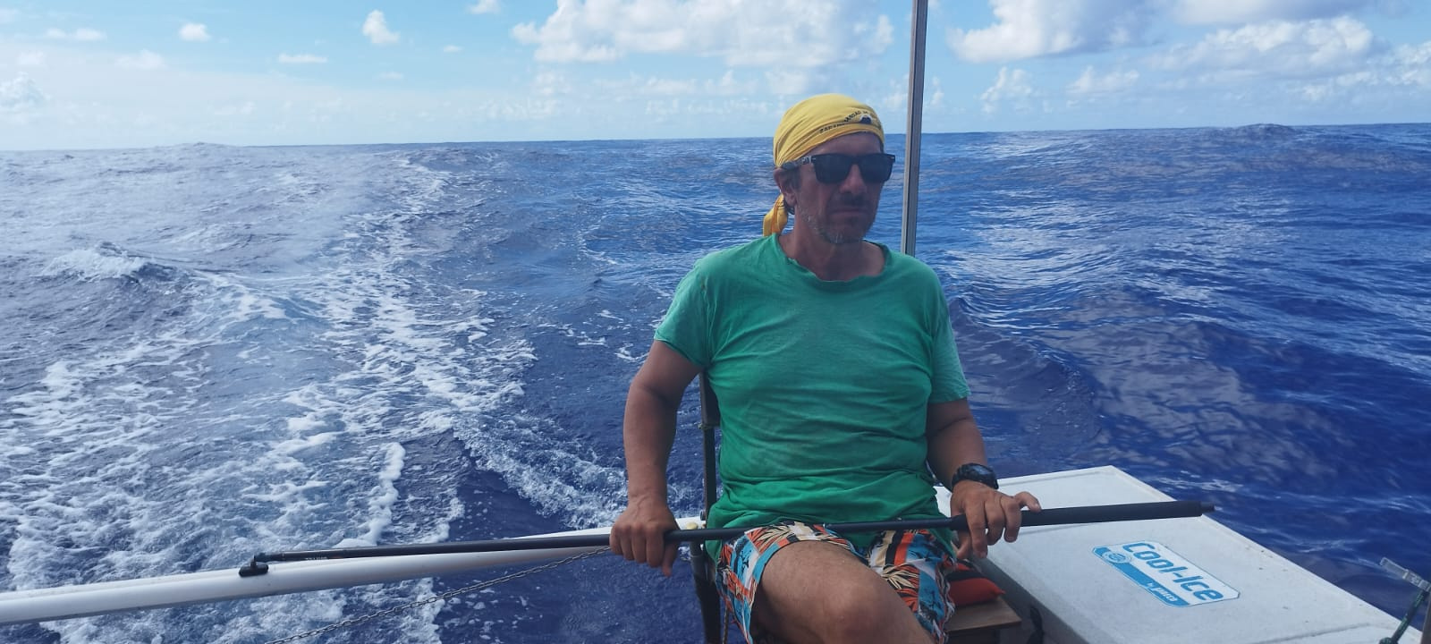 Команде пришлось спустить парус и выбросить с носа за борт плавучий якорь — водный парашют. Катамаран удалось стабилизировать, после чего сняли с правой кормы рулевую коробку. В распоряжении путешественников есть одно запасное перо руля.