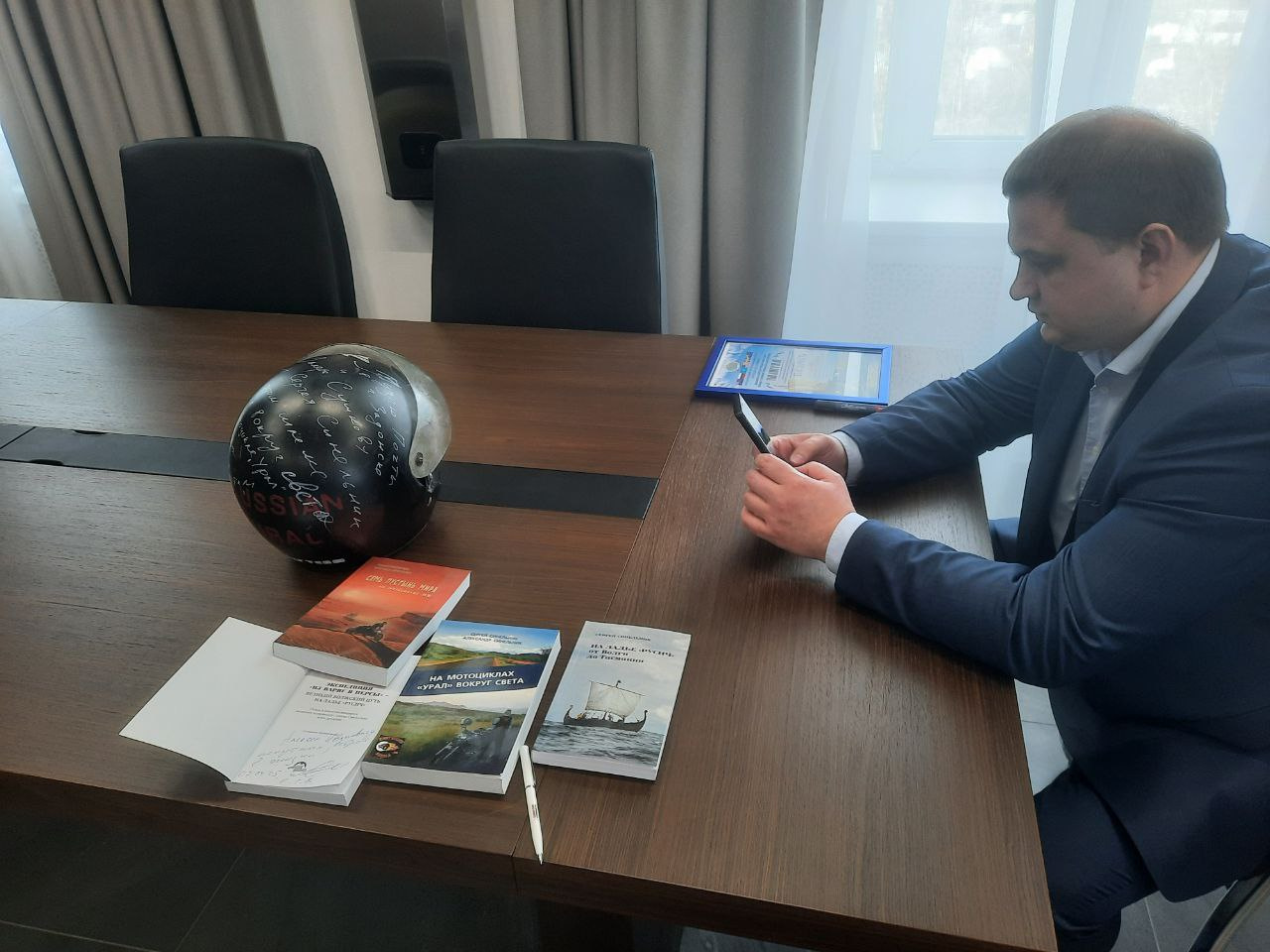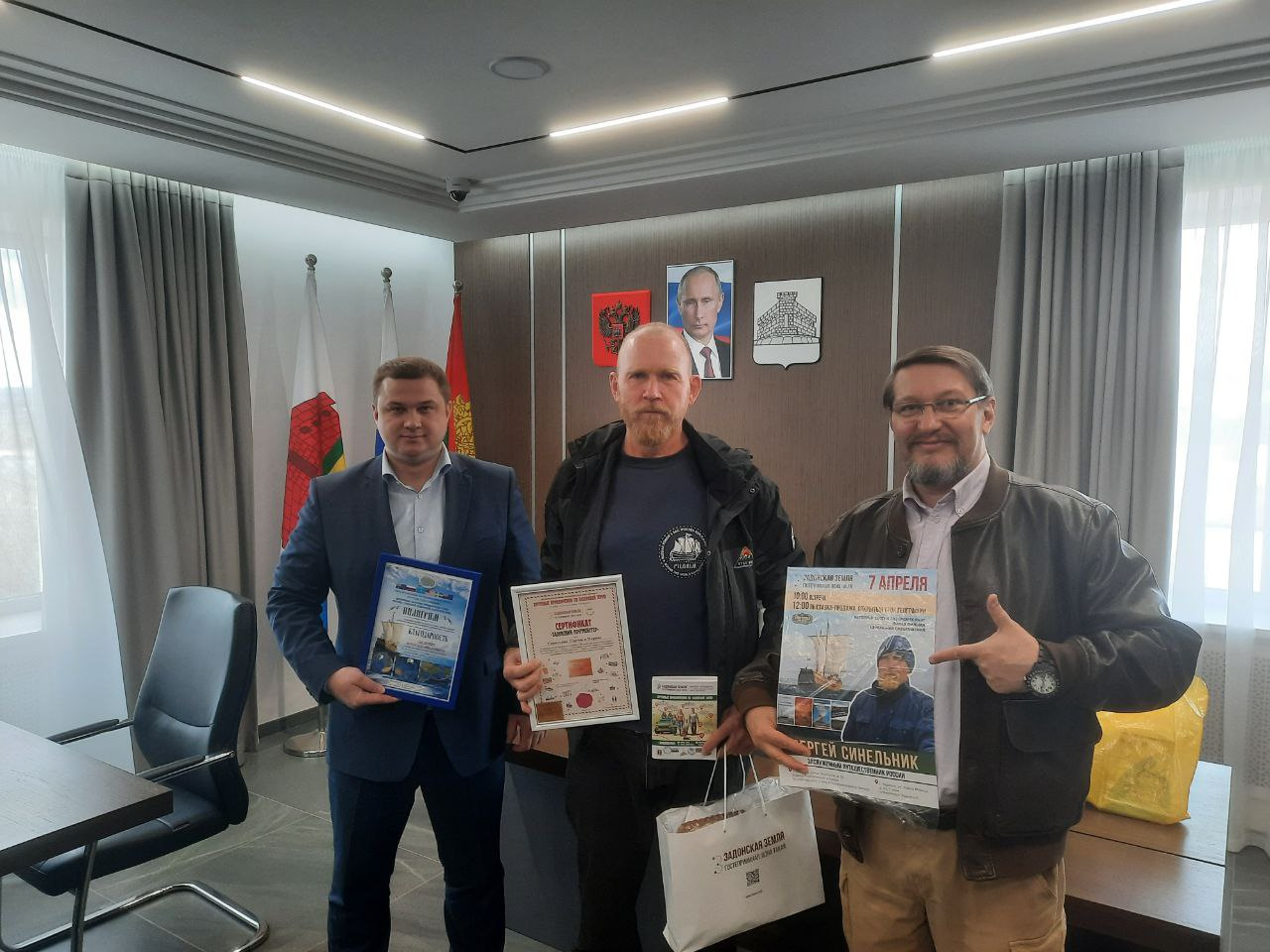 В кабинете у главы Задонского Муниципального района Щедрова Алексея Ивановича прошла церемония спецгашения почтовой карточки «Великие русские путешественники под призмой филатуризма: Сергей Синельник», в которой приняли участие сам известный путешественник-кругосветчик, исследователь-путешественник, основоложник филатуризма, главный редактор и автор первого в России филагид-путеводителя, автор и руководитель проекта «Великие русские путешественники. Под призмой филатуризма» https://postventure.ru/golden-collection Валерий Сушков и глава Задонского Муниципального района Алексей Щедров, который в последние годы со своей командой очень активно и масштабно развивает внутренний и вьездной туризм и индустрию гостеприимства на Задонской земле и вывел малый городок Задонск в TOP-десятку самых посещаемых малых городов России нашими туристами.