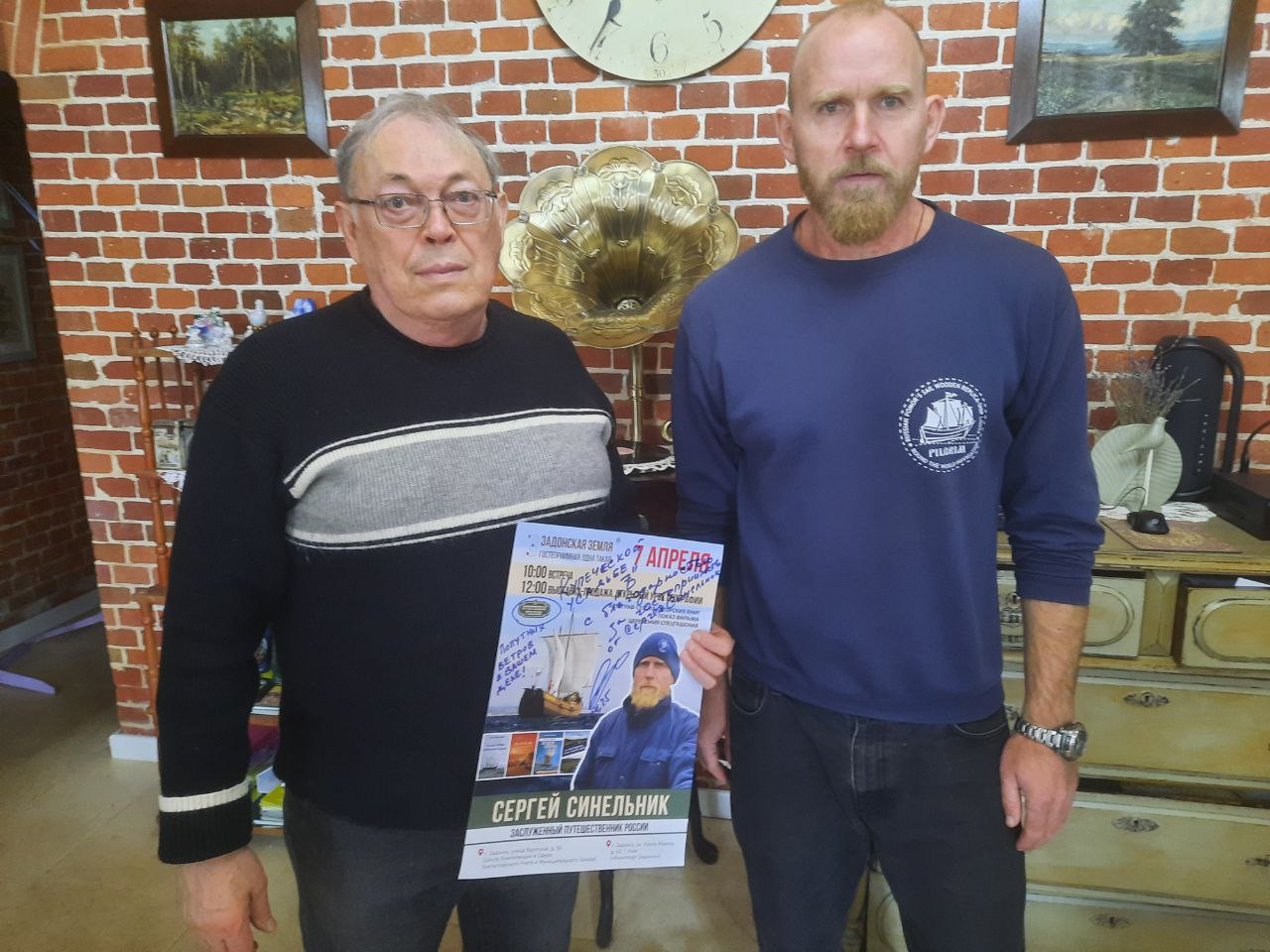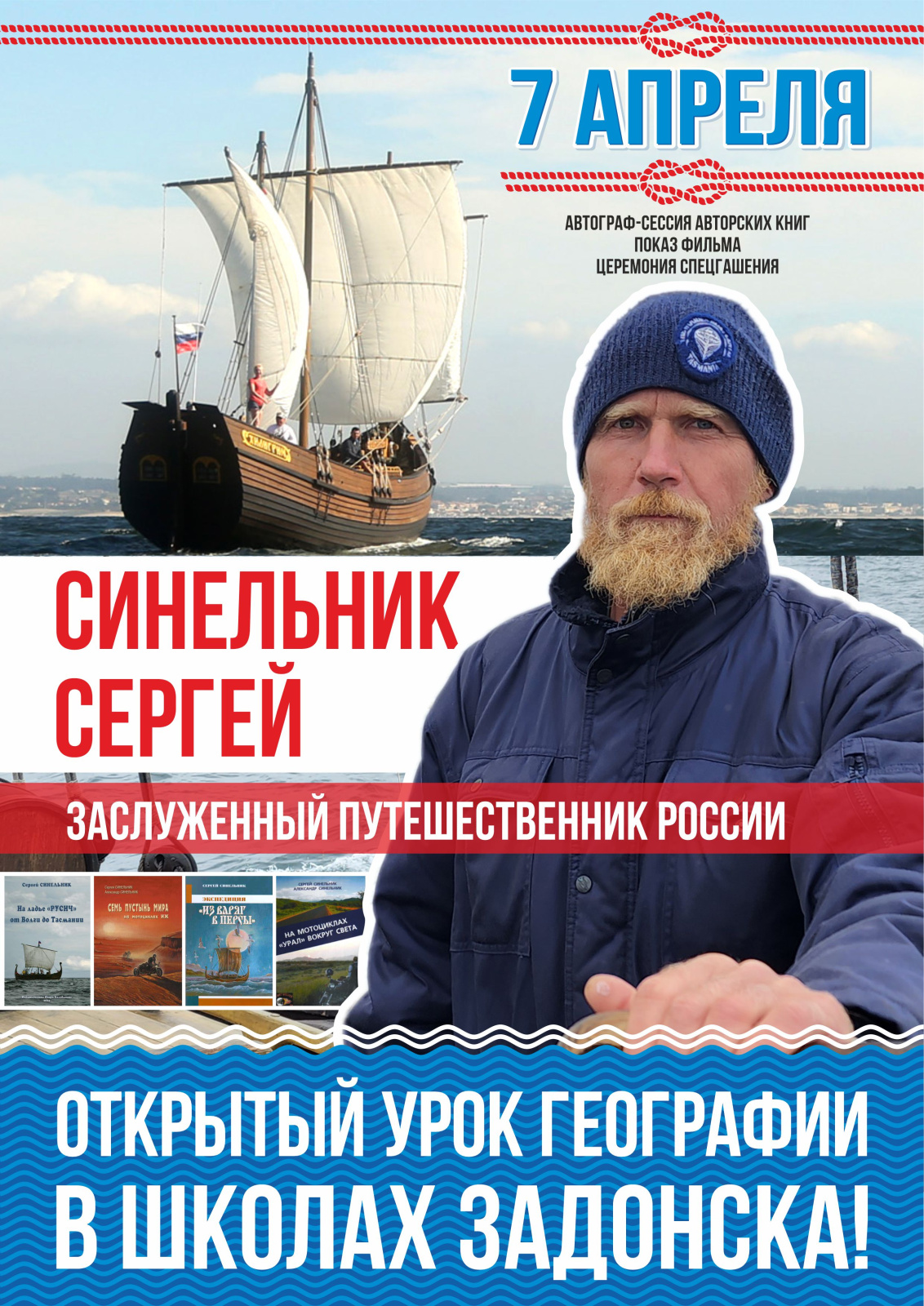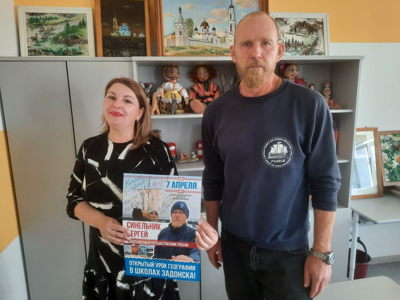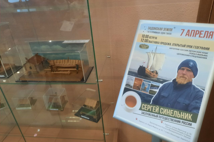 С 5 по 7 апреля 2025 года по приглашению Администрации Задонского муниципального района и своего друга липецкого и приморского исследователя-путешественнника, члена ПКО РГО-ОИАК, Валерия Сушкова город Задонск и Задонскую землю посетил выдающийся и заслуженный русский путешественник-кругосветчик, член ПКО РГО – ОИАК, Сергей Синельник, который прошел свой первый почтовый маршрут - городской историко-культурный филатуристический квест-маршрут «Задонск - столица филатуризма» вместе с филагид-путеводителем «Почтовые приключения по Задонской земле», а также провел в средних школах города Задонска для школьников открытый урок географии, а в Кинотеатре «Задонск» в холле на 1 этаже открыл Художественную выставку деревянных моделей и миниатюр, которые прошли все этапы кругосветной экспедиции на поморской лодье «Пилигрим», более 22000 миль (длину экватора!), В каждом порту и марине во время кругосветной экспедиции, на борт поднимались многотысячная армия людей из разных стран мира и с искренним интересом знакомились с частицей истории и культурой России.