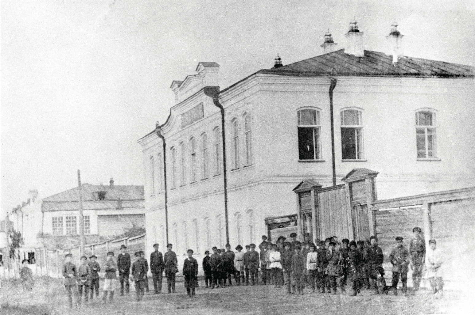Группа детей и взрослых у здания Кузнецкого уездного училища. Начало XX века