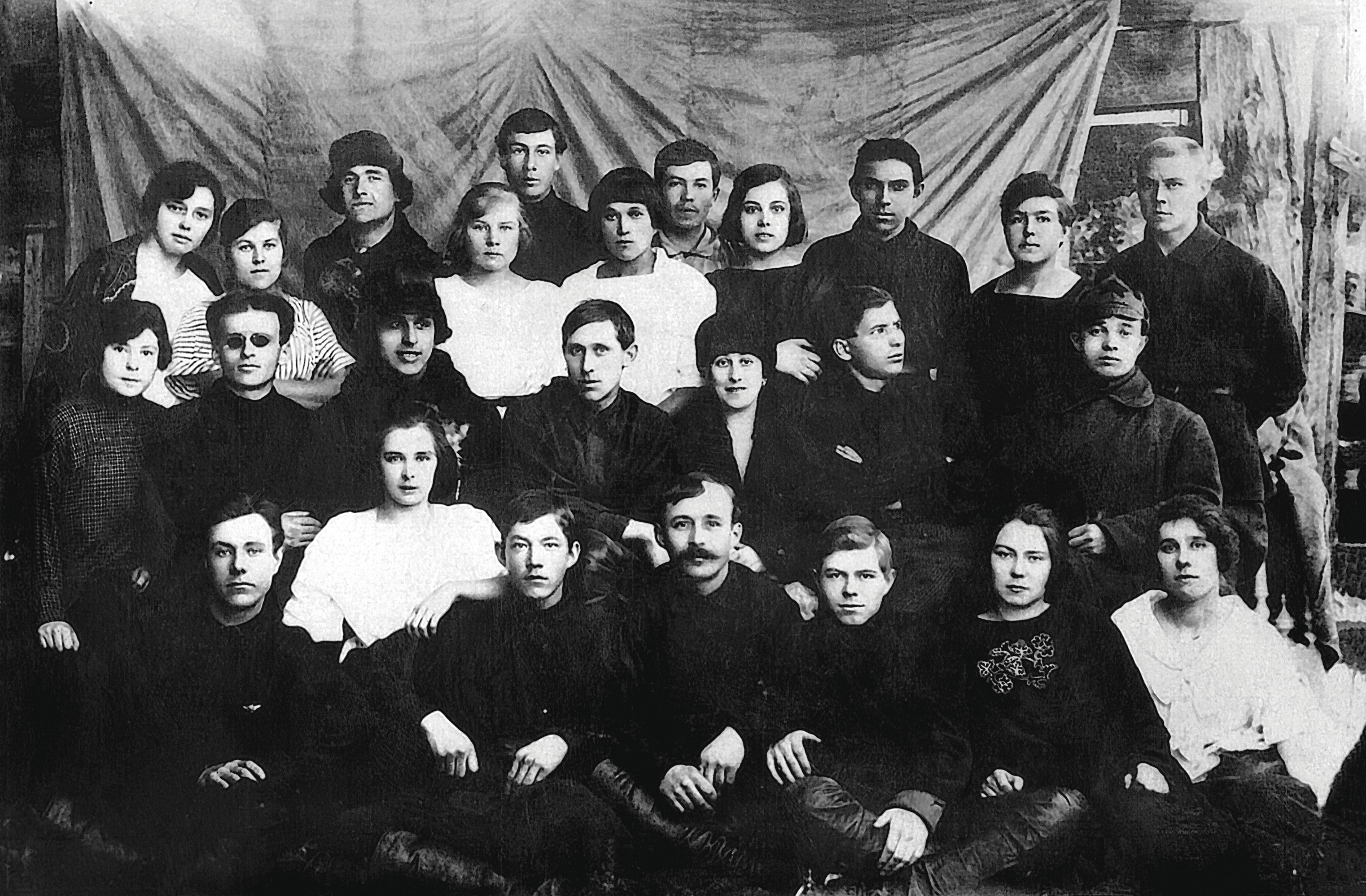 Агитационный театр «Синяя блуза». Слева направо: верхний ряд: Л.И. Оттыгашева, Н.А. Перлова, П. Коновалов, Ширяева, неизвестный, Паршукова, неизвестный, Козлова, неизвестный, А. Шелегина, Кузмин; средний ряд: неизвестный, А.Г. Прибытков, С. Ярославцев, П.