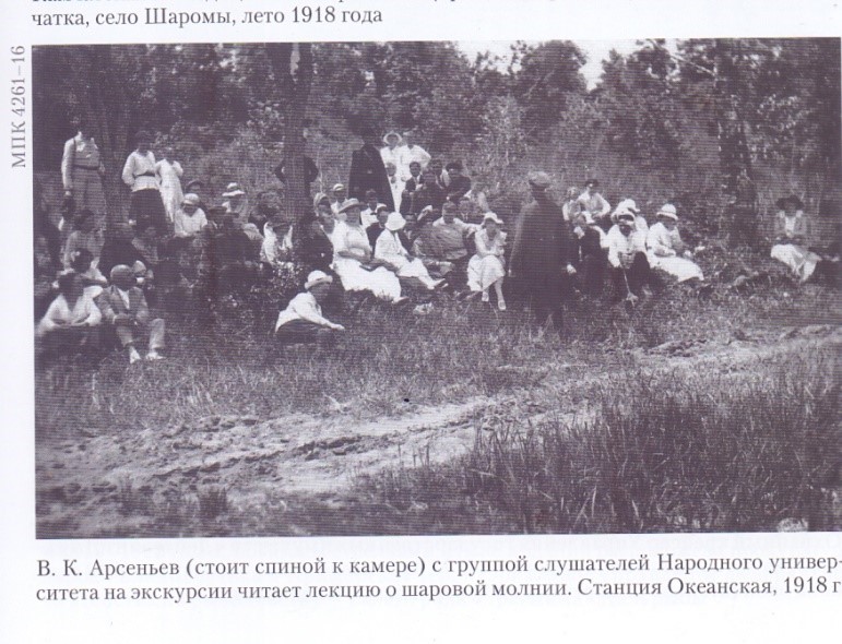 В.К. Арсеньев (стоит спиной) читает лекцию слушателям Народного университета. Станция Океанская. 1918 г.