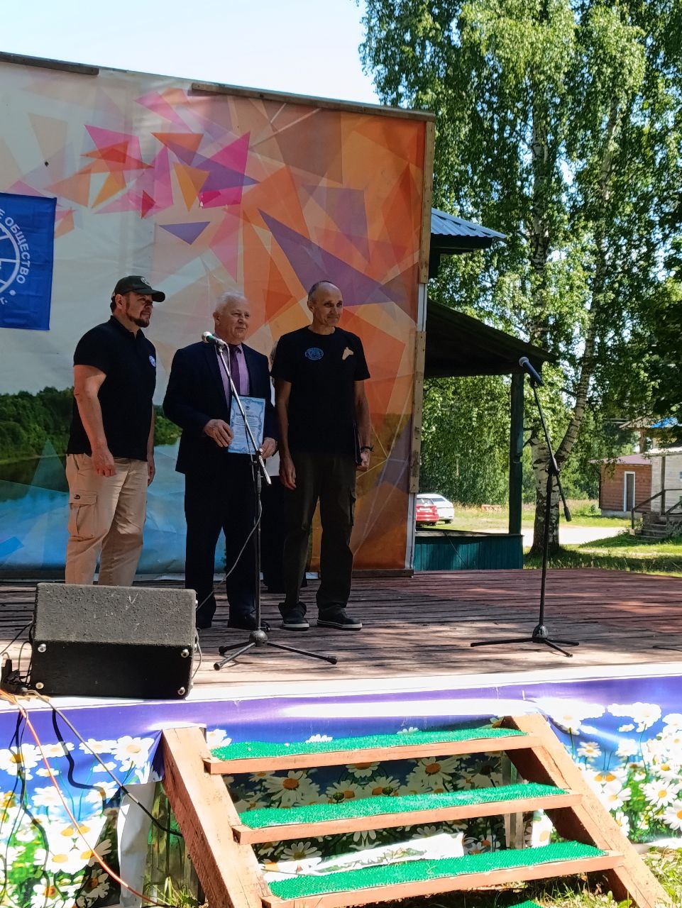 Дмитрий Шнур и Александр Новиков вручают благодарственное письмо Костромского отделения РГО за помощь в организации и проведении фестиваля главе Шарьинского района Николаю Глушакову
