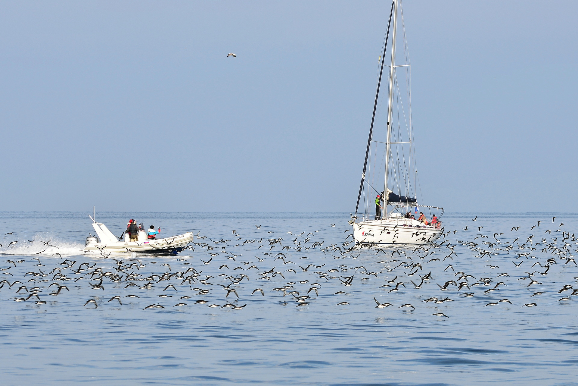 Левантский буревестник, фото: Ю.Югансон Левантский буревестник в открытом море, фото: Ю.Югансон Стая левантского буревестника у маяка Северного мола Севастополя, фото: Ю.Югансон Пара розовых фламинго с Солёной бухте Севастополя, фото: Ю.Югансон Фламинго на рассвете, фото Ю.Югансон Розовые фламинго в Севастополе, фото: Ю.Югансон