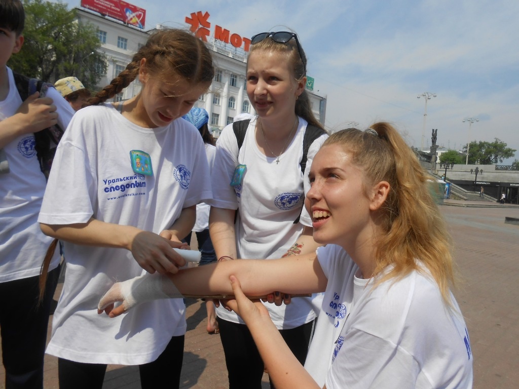 Вступительное слово председателя Свердловского областного отделения РГО Михаила Горюнова Мобильный планетарий - сфера в которой спроецировано небо На этапе разведения костра курсанты МЧС проводят просветительскую работу Награждение проходило в шатре Напутствие председателя Свердловского областного отделения РГО Михаила Горюнова. Рядом - главный редактор журнала "Уральский следопыт" Максим Фирсов Проверка умения вязать узлы Рисунок из этапа История Теоретический тур в амфитеатре фонтана Узлы Этап Гербы городов Урала Этап История - пещера первобытного человека в подземном переходе Этап Лекарственные растения Этап Литературная география - определение страны по отрывку из произведения Этап Оказание первой помощи Этап Орнитология Этап Переправа со страховкой судей Этап Разведение костра Этап Растения Урала Определение паразитов леса