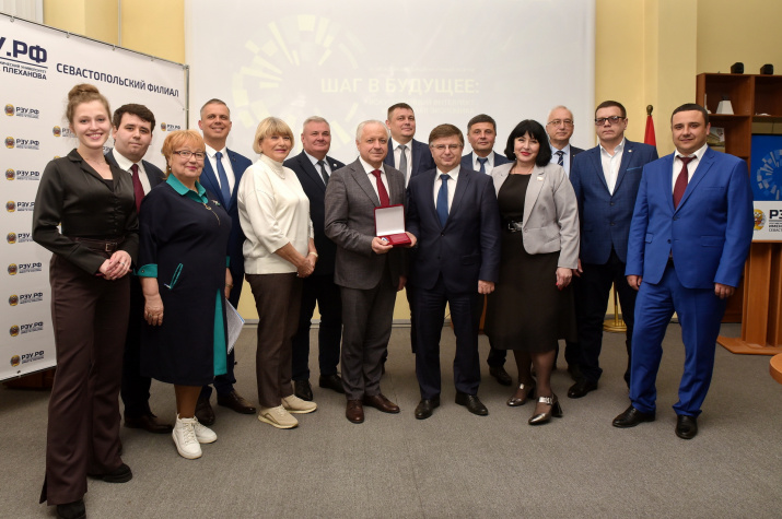 Заместитель губернатора А.Парикин вручает медаль коллективу Университета, фото: Ю.Югансон Круглый стол в Севастопольском филиале РЭУ им.Плеханова, фото: Ю.Югансон Владимир Воробьёв вручает членский билет РГО директору филиала и руководителю круглого стола Игорю Александровичу Шевчуку, фото: Ю.Югансон Заместитель губернатора вручает медаль «В ознаменование 10-летия возвращения Севастополя в Россию» коллективу университета, фото: Ю.Югансон Фото: Ю. Югансон