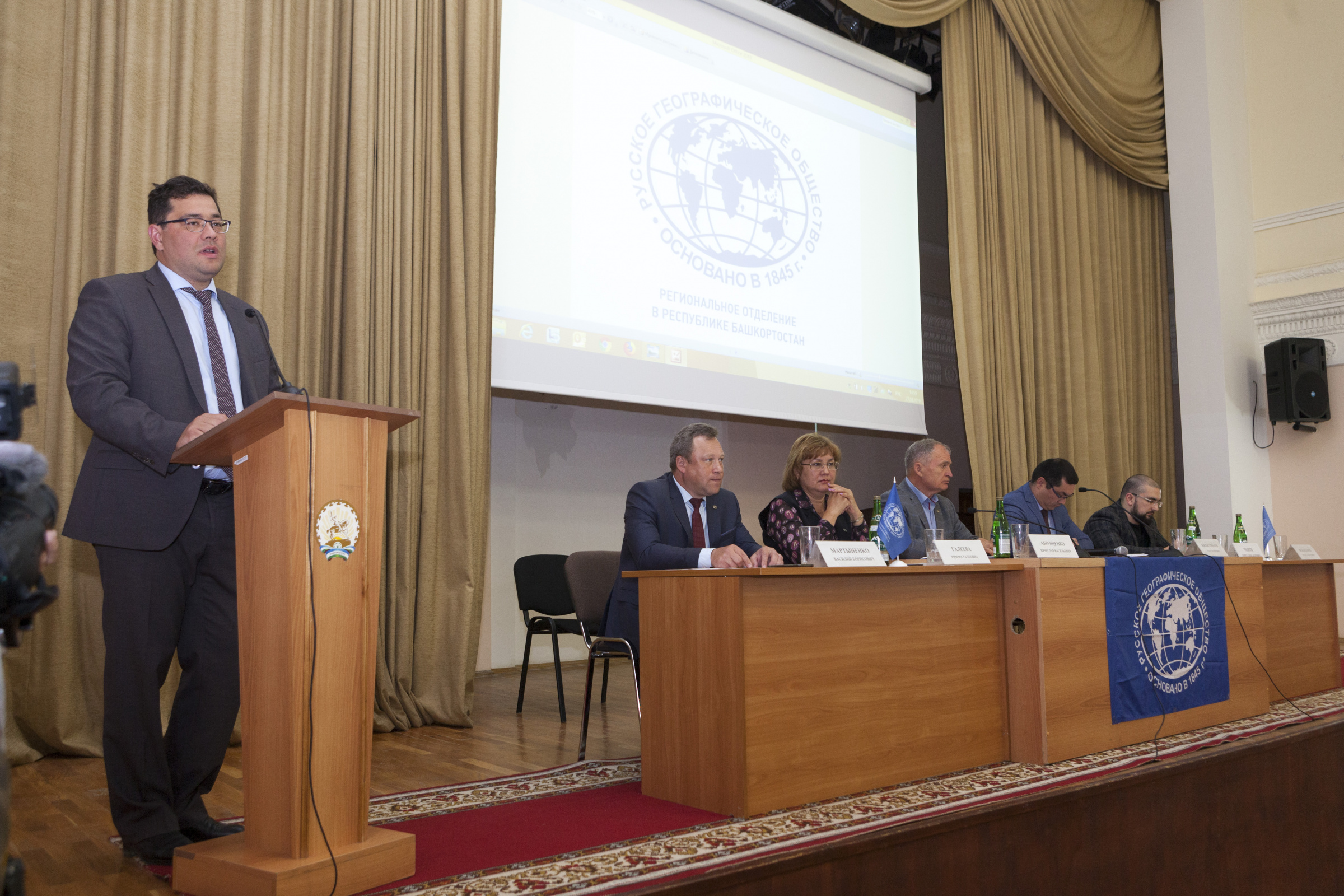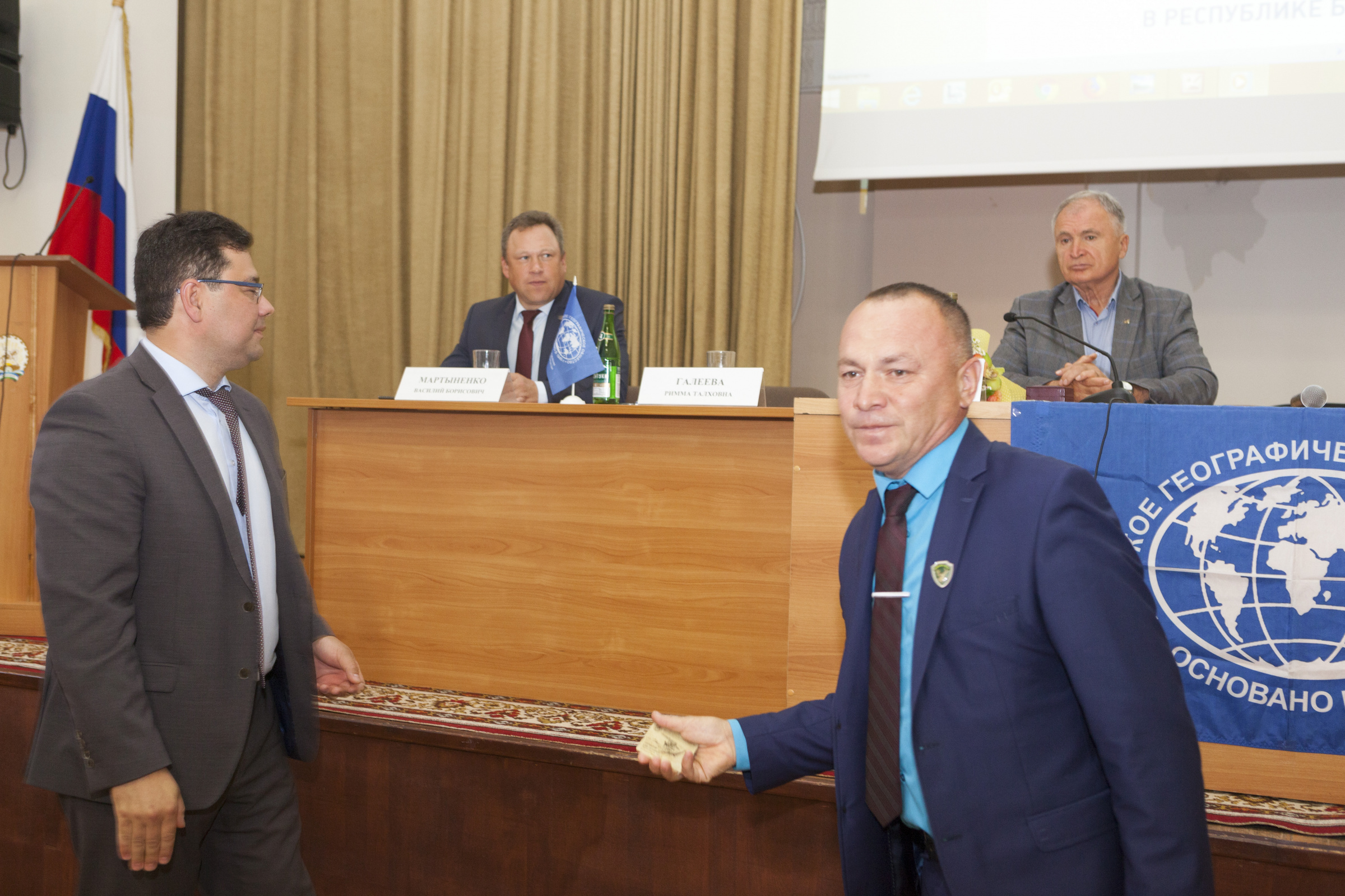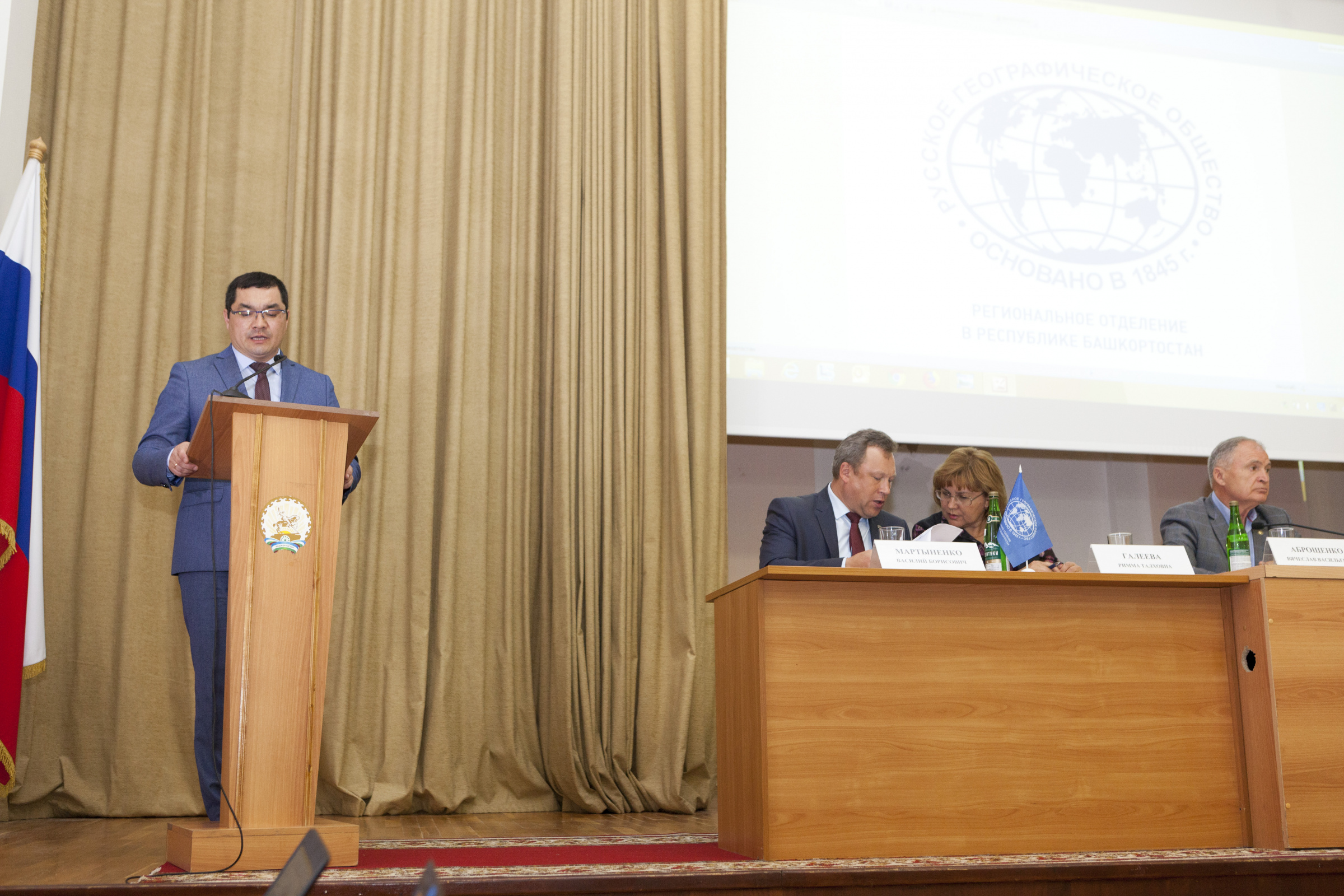 Президиум собрания. Выступление заместителя руководителя администрации Главы республики по внутренней политике Урала Кильсенбаева Выступление советника Департамента регионального развития РГО Давида Тедеева Выступление председателя собрания, председателя природоохранительной комиссии Василия Мартыненко Выступление заместителя председателя отделения Вячеслава Аброщенко Выступление избранного председателя отделения Салавата Сагитова Выступление куратора Международной образовательной акции "Географический диктант" по Республике Башкортостан Закиры Латыповой Давид Тедеев вручил Закире Латыповой Благодарственное письмо вице-президента РГО Артура Чилингарова Вручение членских билетов РГО Вручение членских билетов Вручение членских билетов