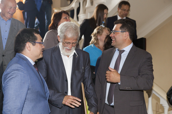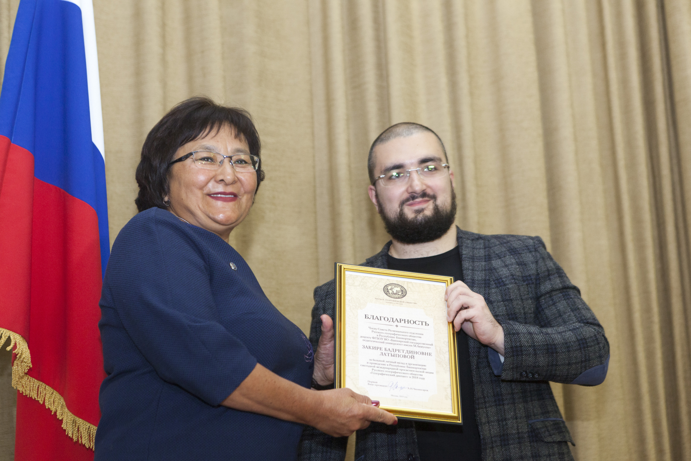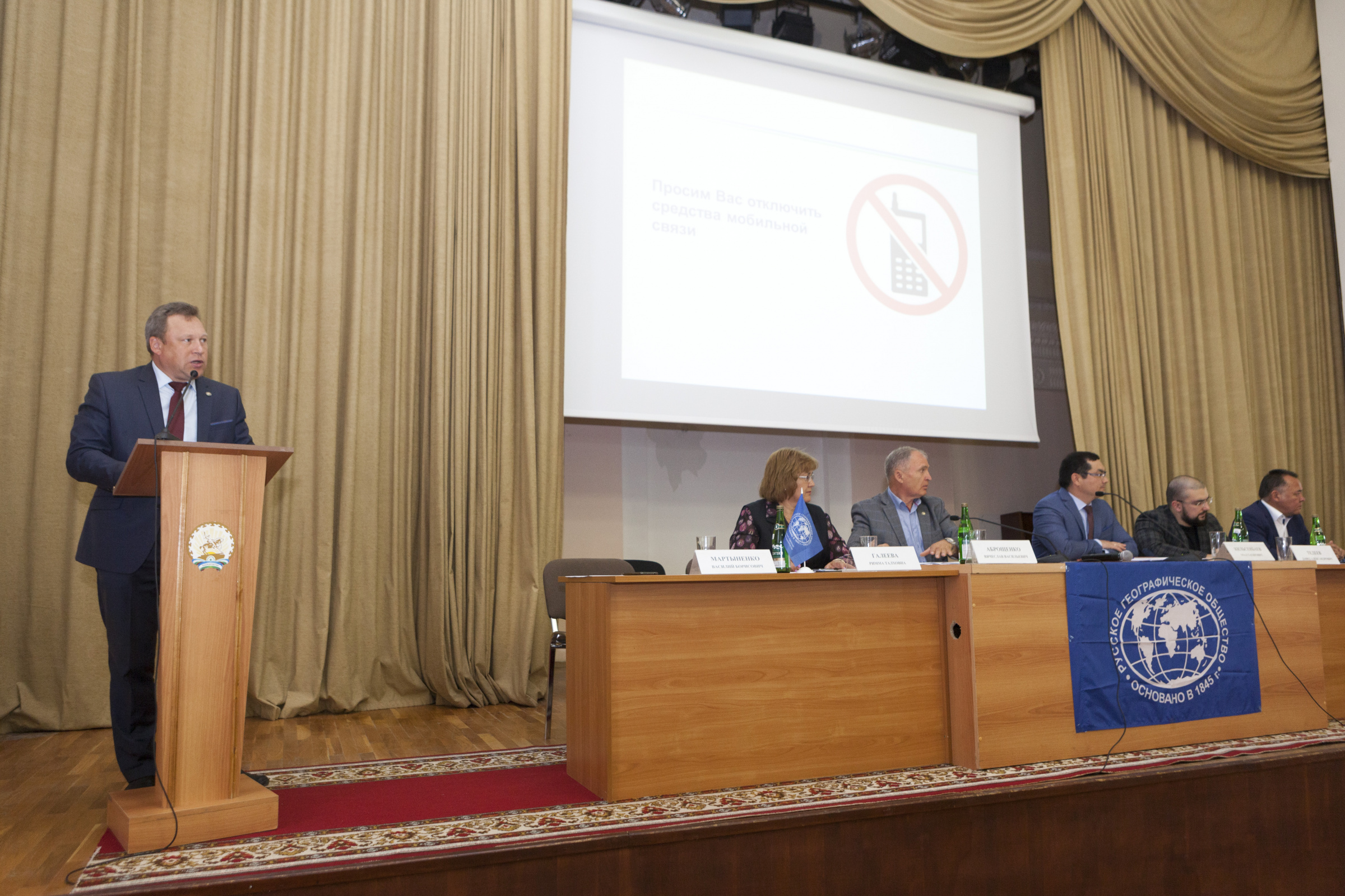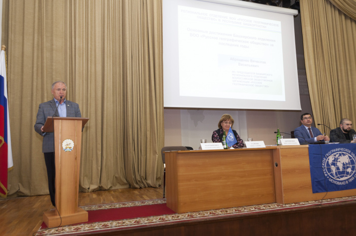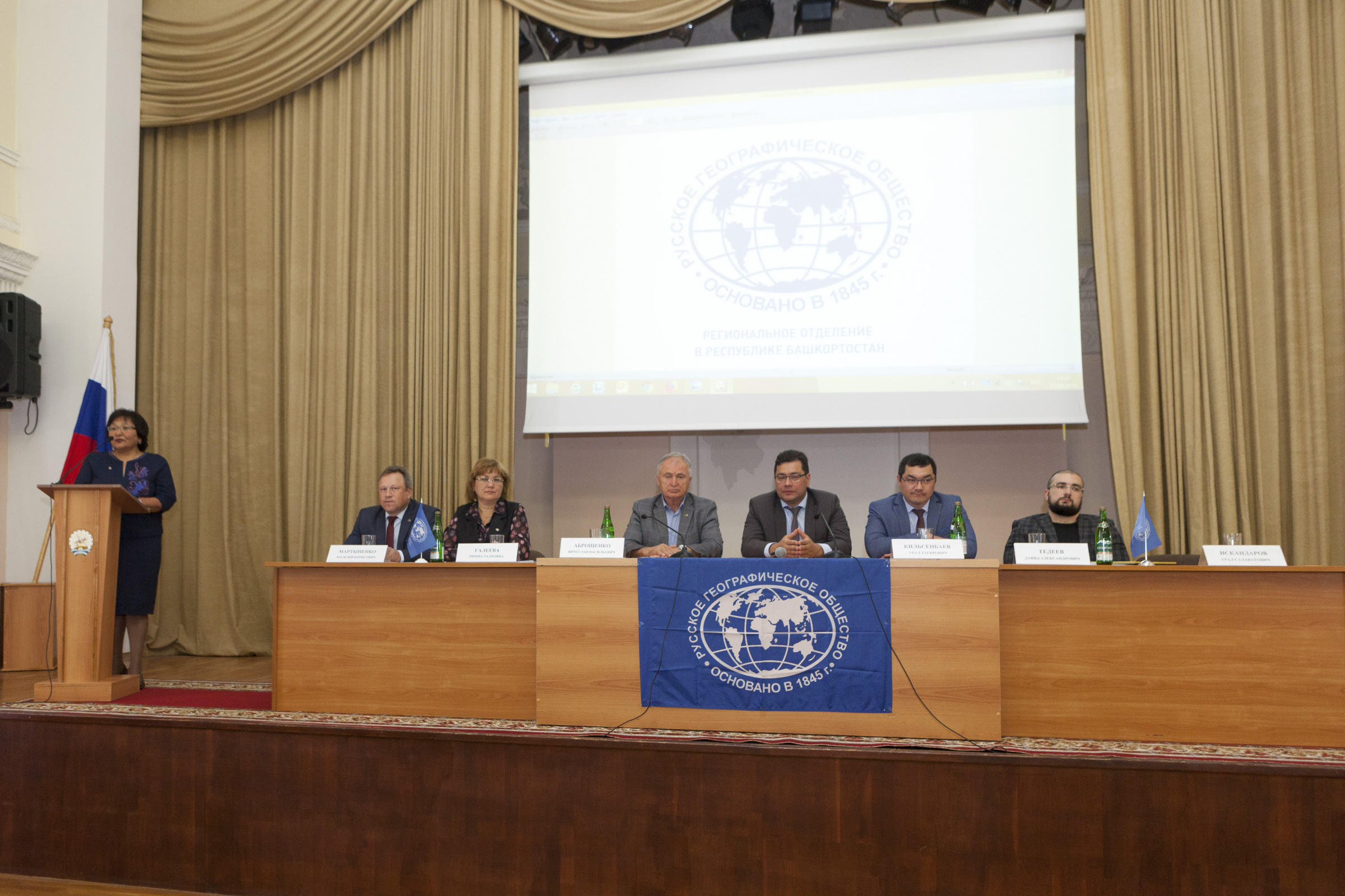 Президиум собрания. Выступление заместителя руководителя администрации Главы республики по внутренней политике Урала Кильсенбаева Выступление советника Департамента регионального развития РГО Давида Тедеева Выступление председателя собрания, председателя природоохранительной комиссии Василия Мартыненко Выступление заместителя председателя отделения Вячеслава Аброщенко Выступление избранного председателя отделения Салавата Сагитова Выступление куратора Международной образовательной акции "Географический диктант" по Республике Башкортостан Закиры Латыповой Давид Тедеев вручил Закире Латыповой Благодарственное письмо вице-президента РГО Артура Чилингарова Вручение членских билетов РГО Вручение членских билетов Вручение членских билетов